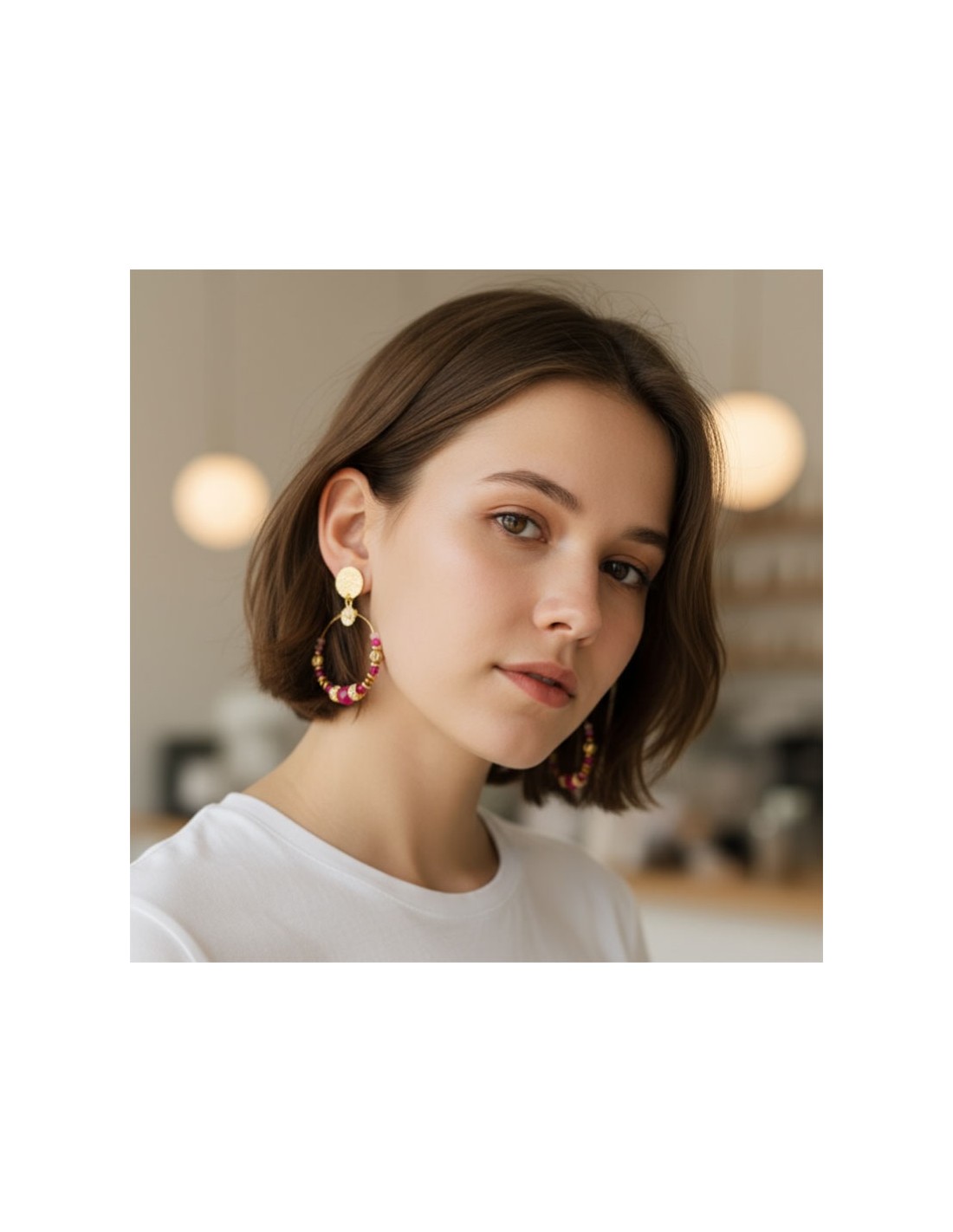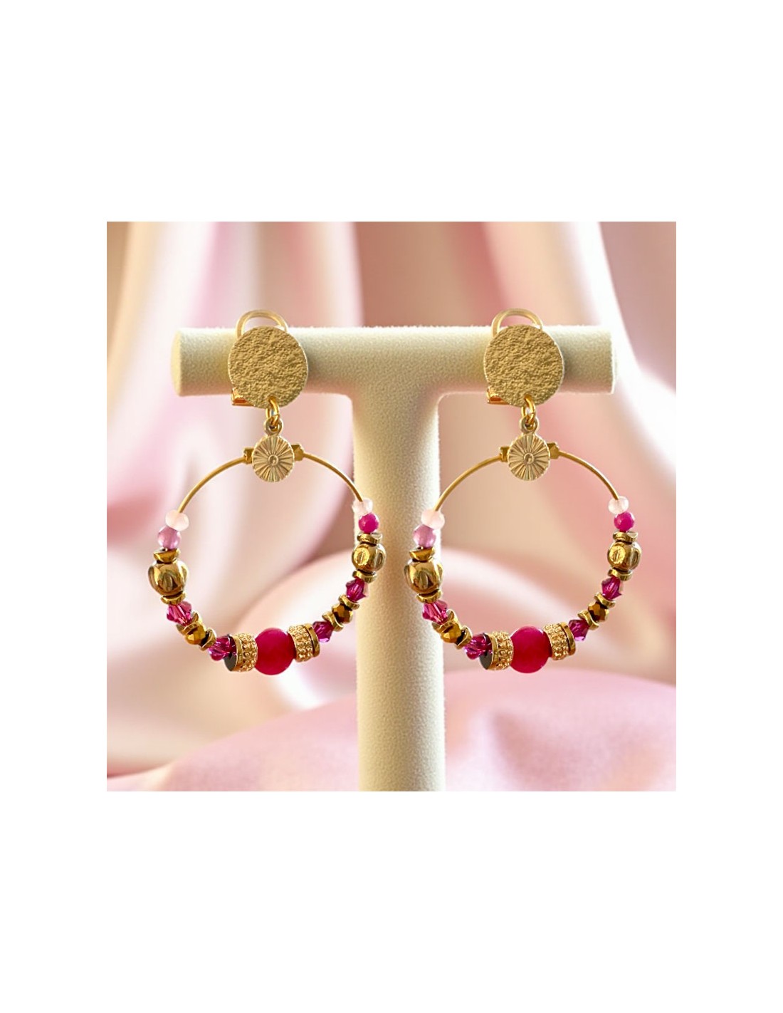 Chaque boucle est ornée de perles roses, dorées et fuchsia délicatement assemblées, créant un équilibre parfait entre éclat et raffinement. Leur structure légère garantit un port agréable toute la journée, même pour les oreilles sensibles.