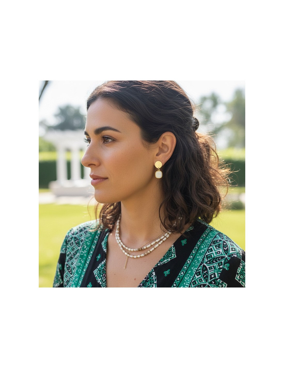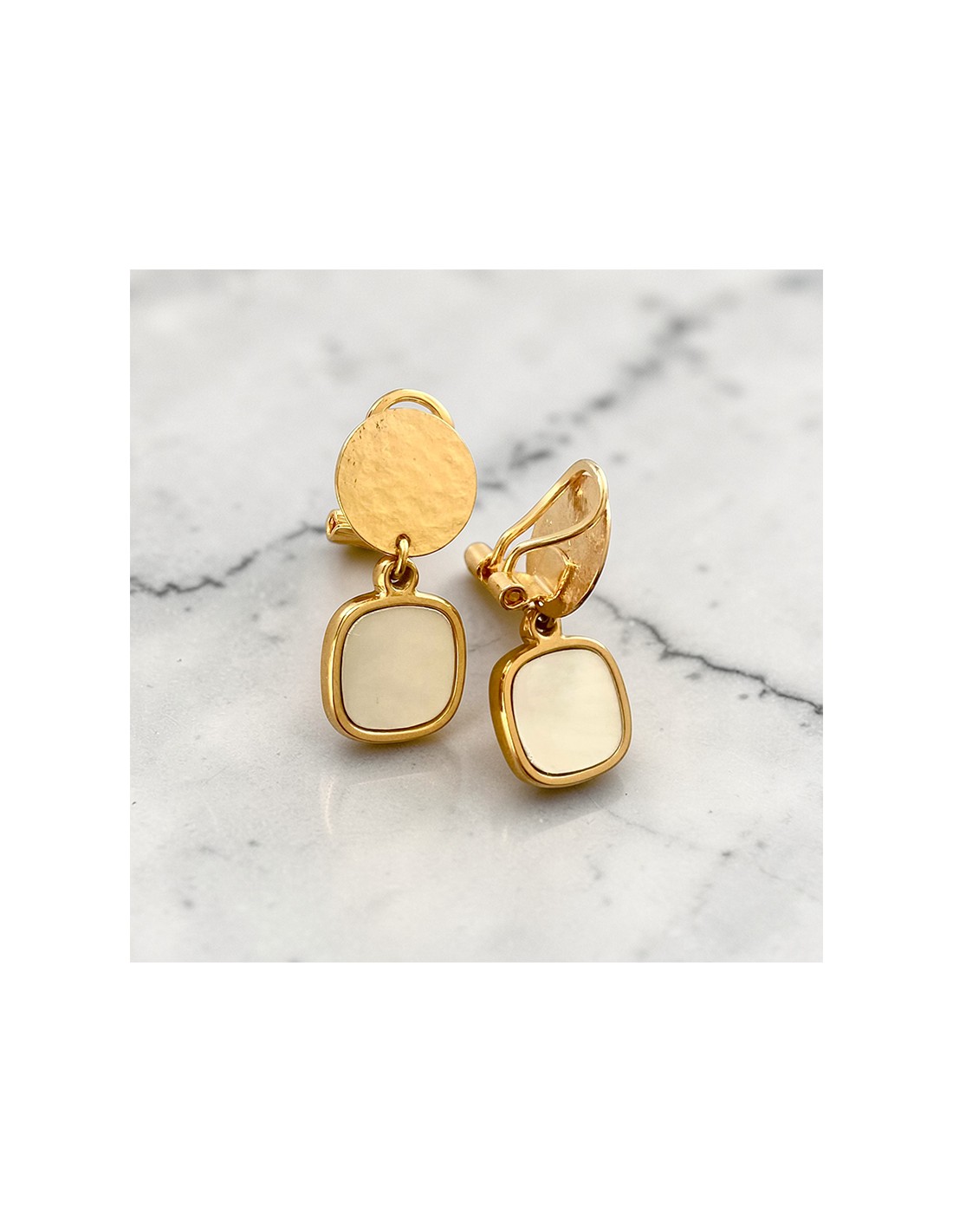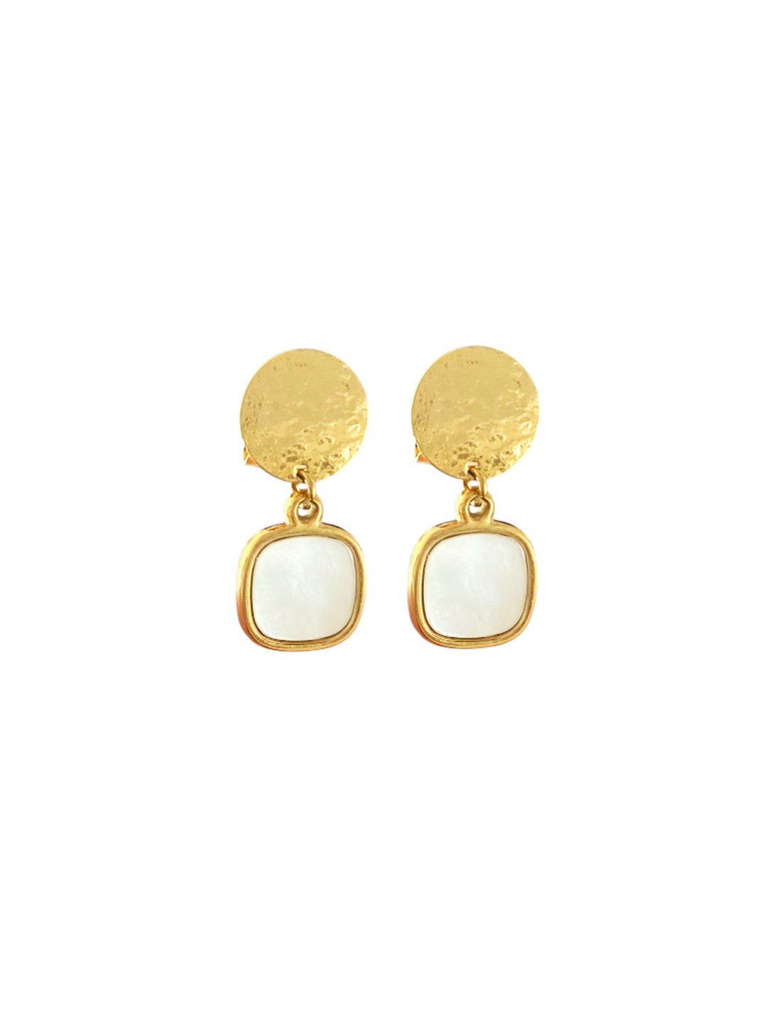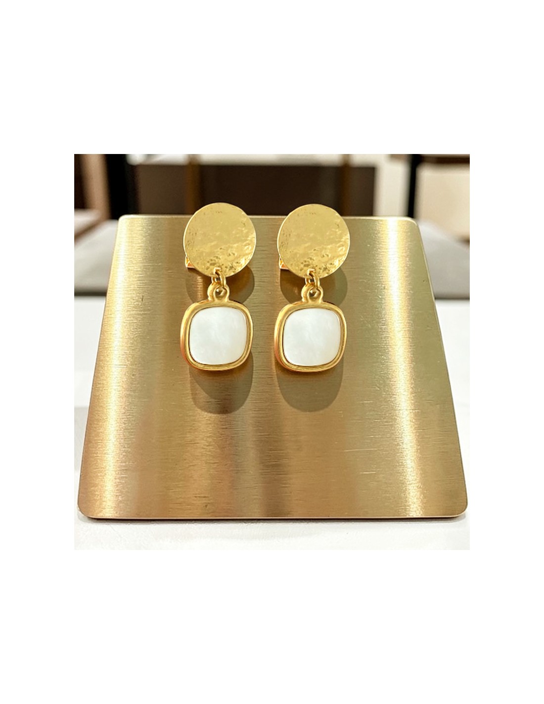 - Matière : Alliage doré hypoallergénique, pierre nacrée naturelle.