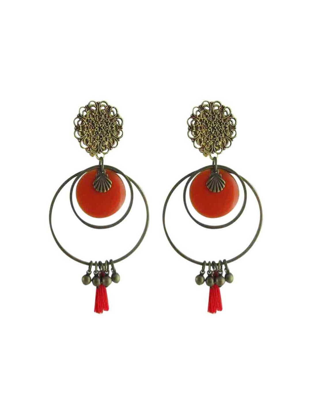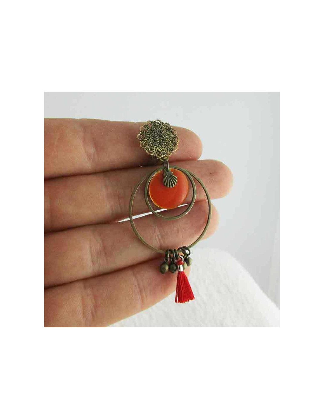Boucles d’oreilles à clip bronze vintage esprit bohème avec créoles et perle orange. Élégantes, légères et confortables, sans perçage.