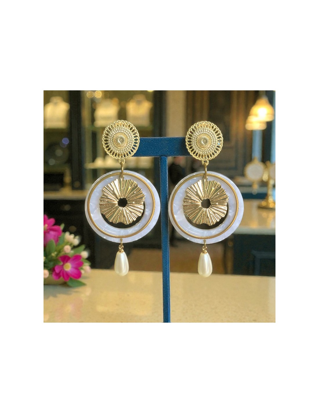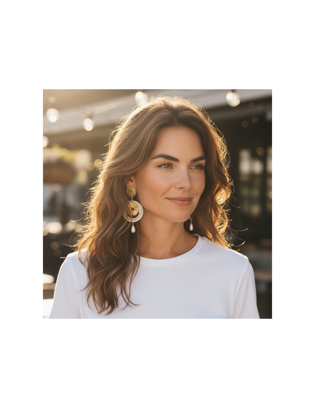 Le clip doré finement travaillé présente un motif circulaire texturé, évoquant un soleil délicatement ciselé. Il soutient un large pendentif rond à l’effet nacré lumineux, subtilement rehaussé d’un élément central doré