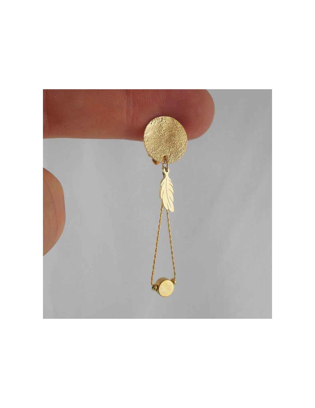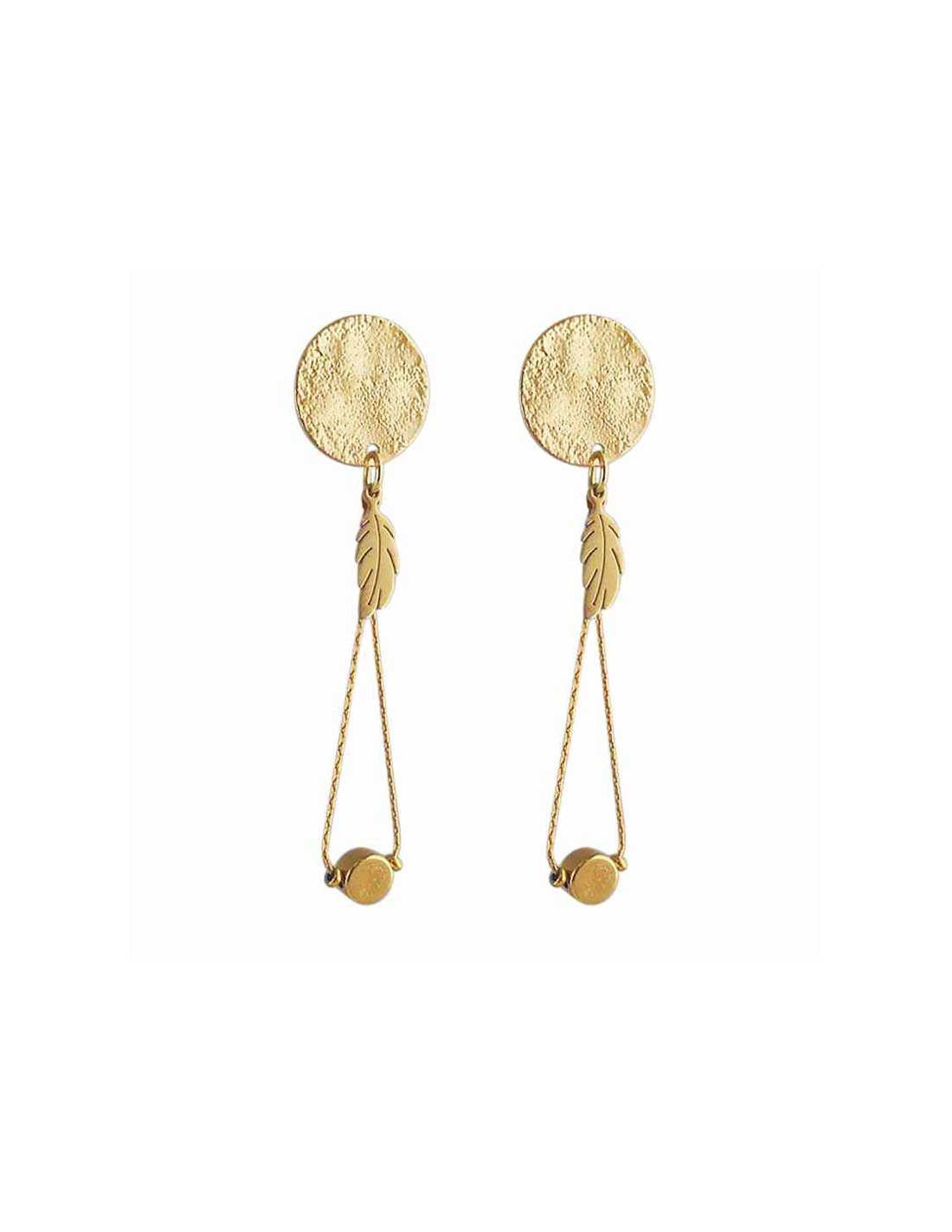 Élégantes et aériennes, ces boucles d’oreilles à clip pendantes, qualité plaqué or séduisent par leur design fin et poétique. Une pastille martelée capte la lumière tandis qu’un motif feuille délicatement sculpté évoque la nature et la féminité. De fines chaînes dorées prolongent la silhouette et se terminent par un petit disque poli.