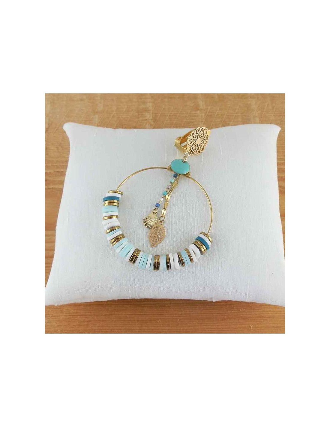 Boucle d'oreille clip créoles en acier inoxydable, légères et colorées en perles japonaises Heishi et hématite avec breloques estivales et toniques.