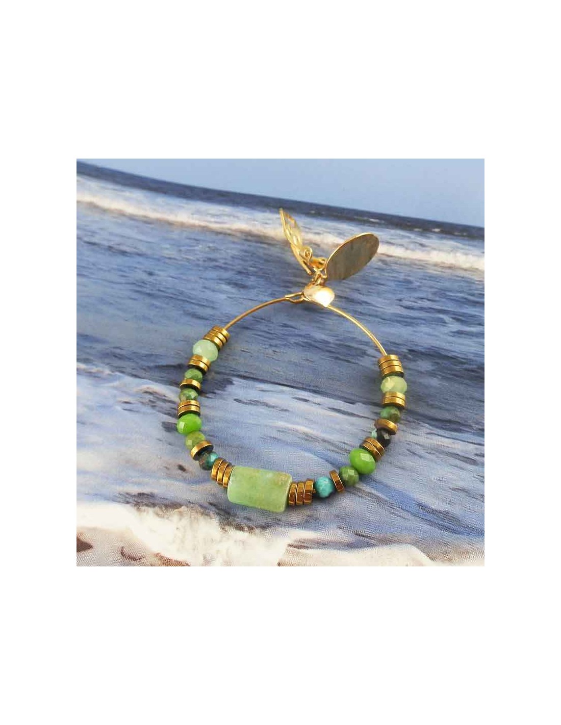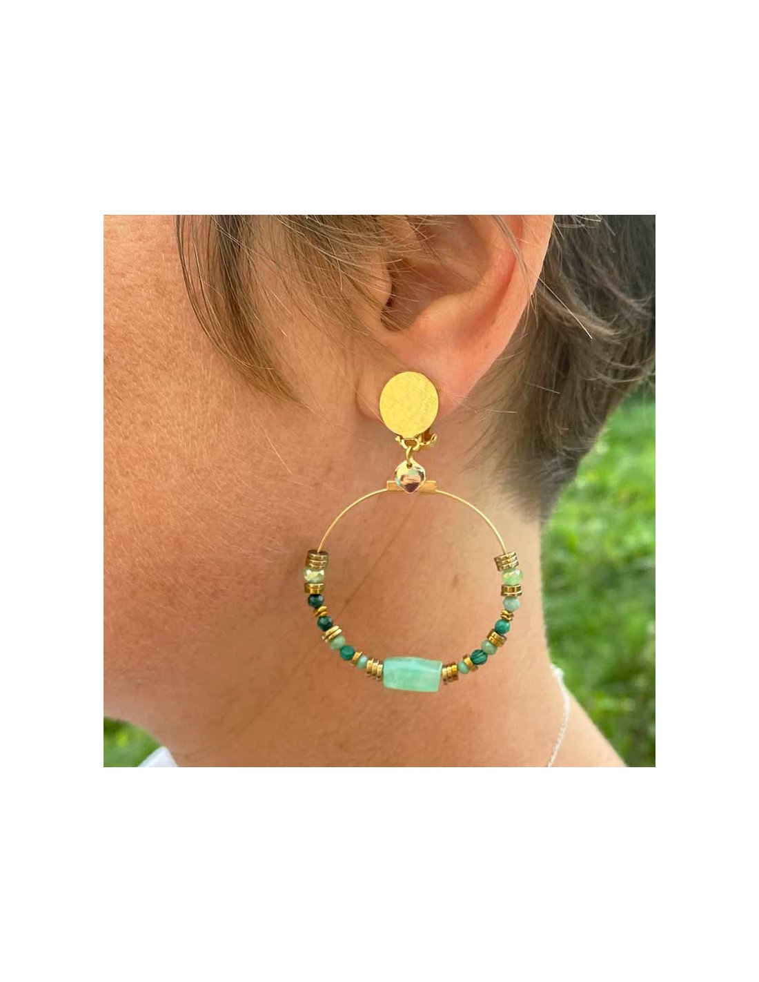 - Pierres naturelles : Chaque boucle est ornée de malachite (vert intense) et de calcédoine (vert doux), deux pierres réputées pour leur beauté et leurs propriétés énergétiques.