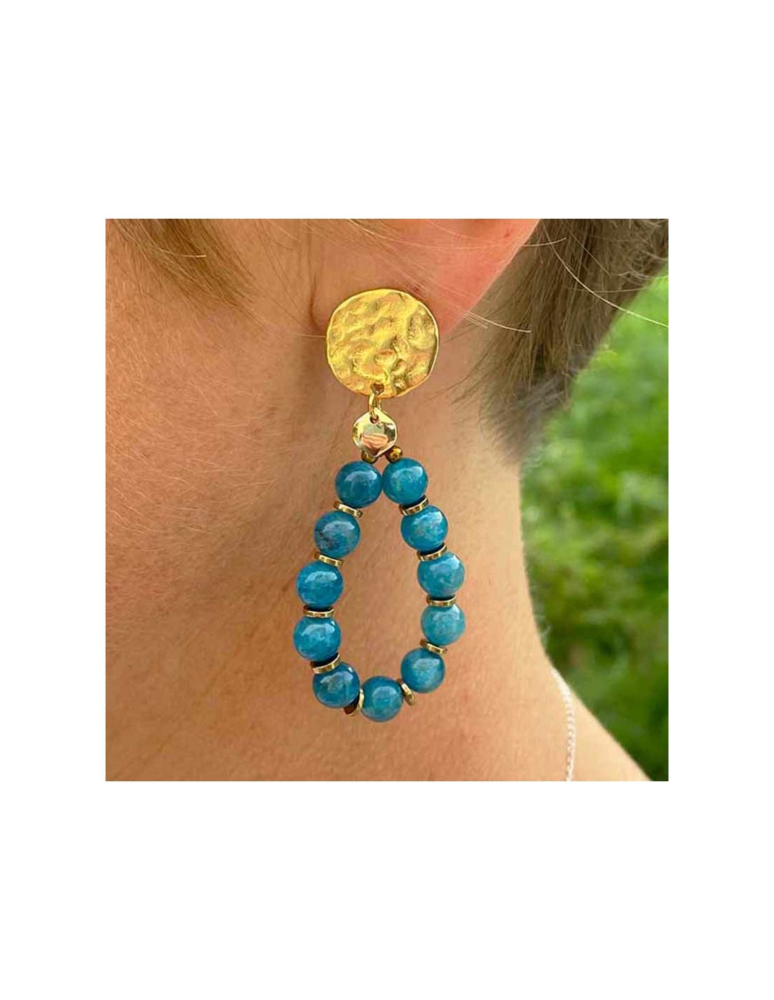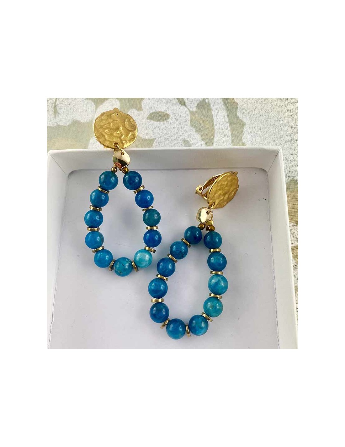 CLIPCHICCréation, forme goutte, composée de perles d'Apatite (modèle bleu), ou de Fuchsite verte et Jade de Birmanie (modèle vert).