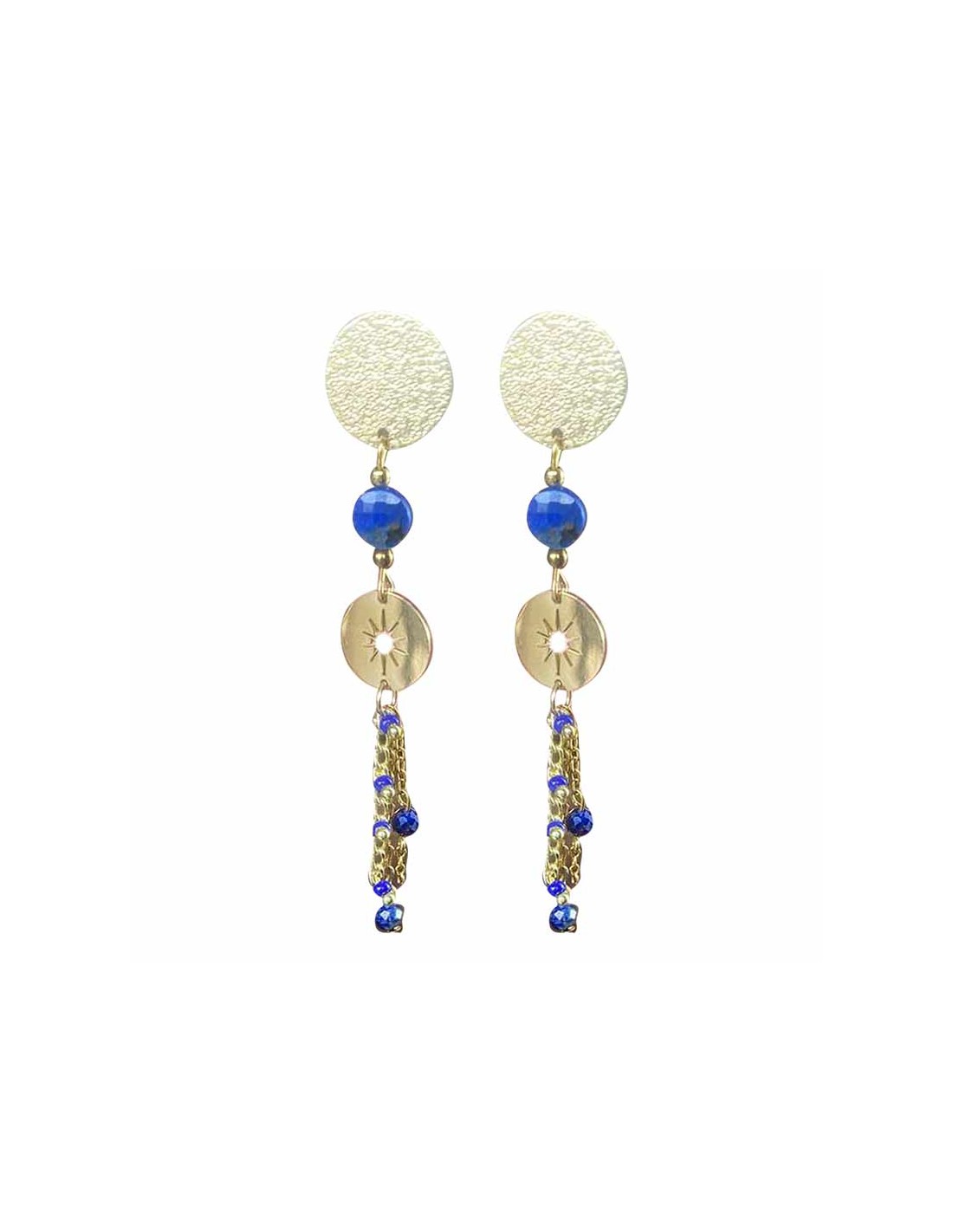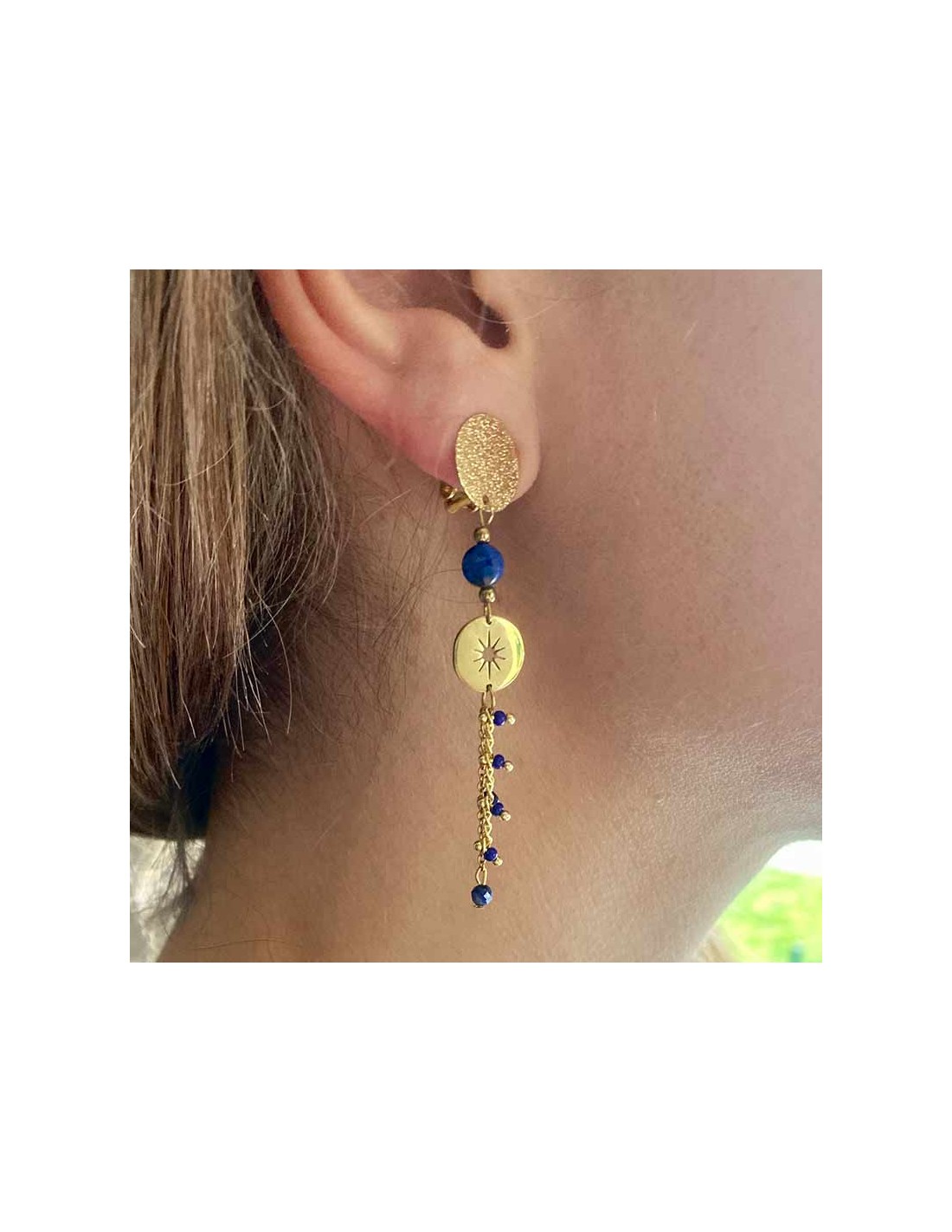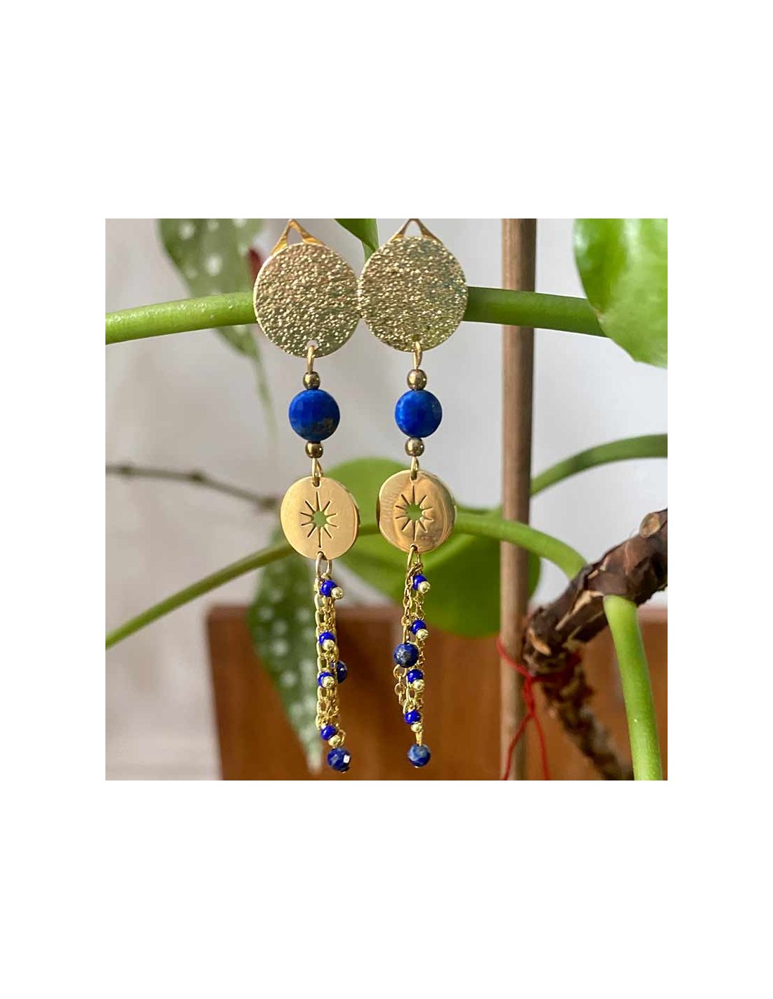 - Des chaînettes dorées ornées de petites perles bleues, ajoutant du mouvement et de la légèreté.