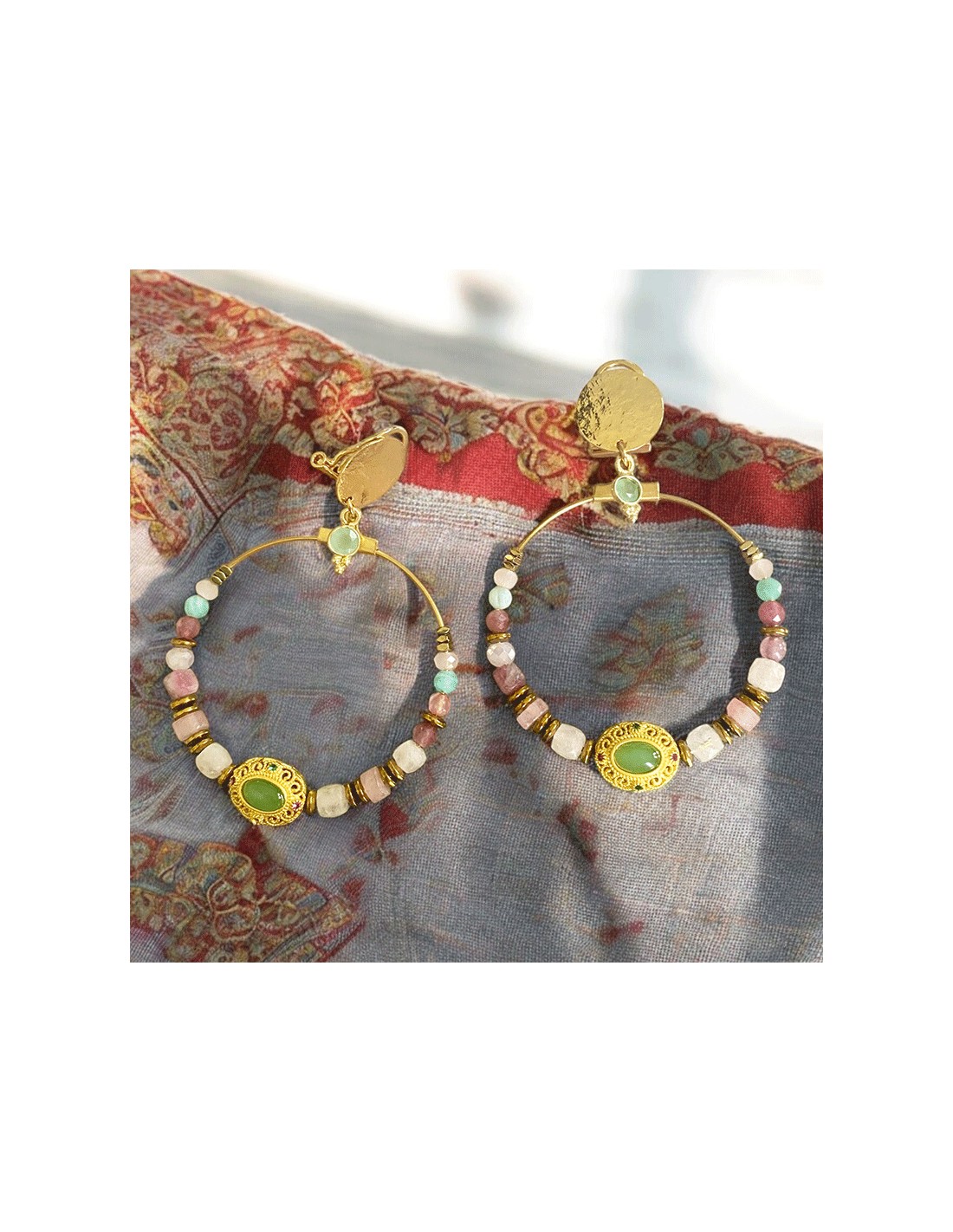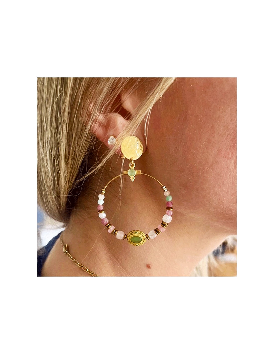 Créole acier inoxydable composée de perles de verre, de calcédoine et d'onyx vert pour la version à dominante vert, et quartz rose, et rhodonite pour la version "rose". Perle centrale en calcédoine sertie dans une estampe dorée travaillée.