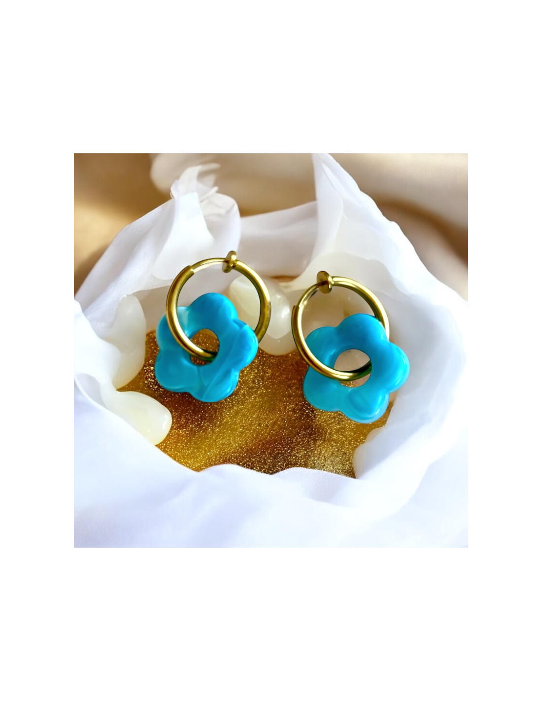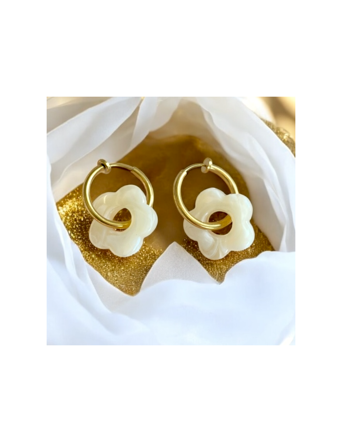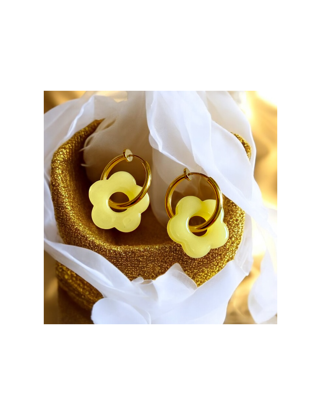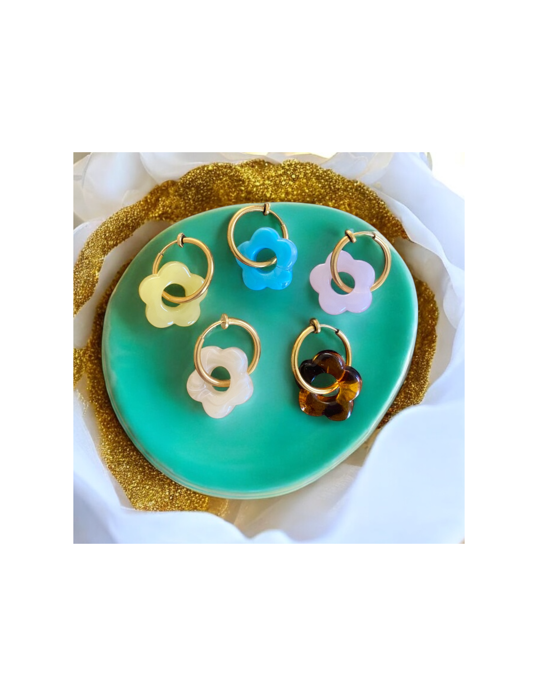 • Design : Chaque boucle d’oreille est composée d’une fleur en acétate, un matériau léger et résistant, disponible en 5 coloris éclatants : jaune pâle, bleu ciel, lilas, blanc nacré et écaille