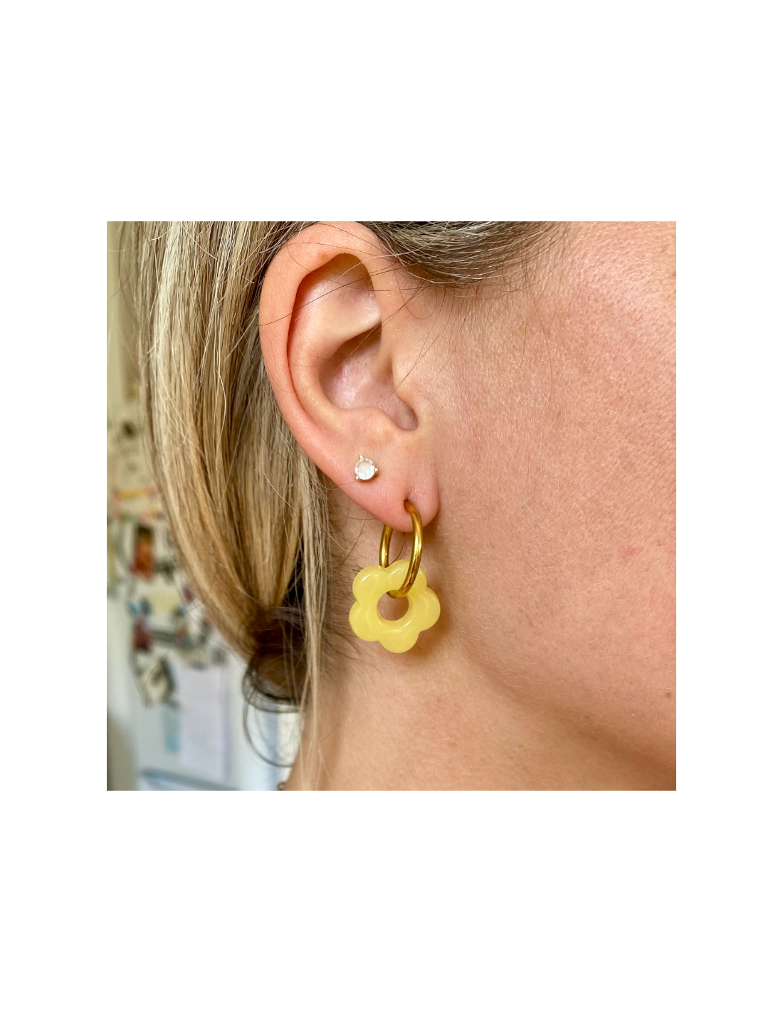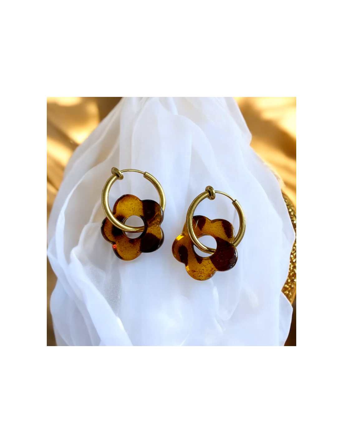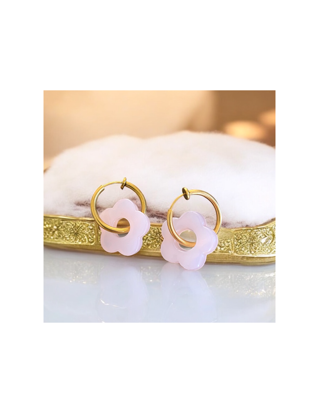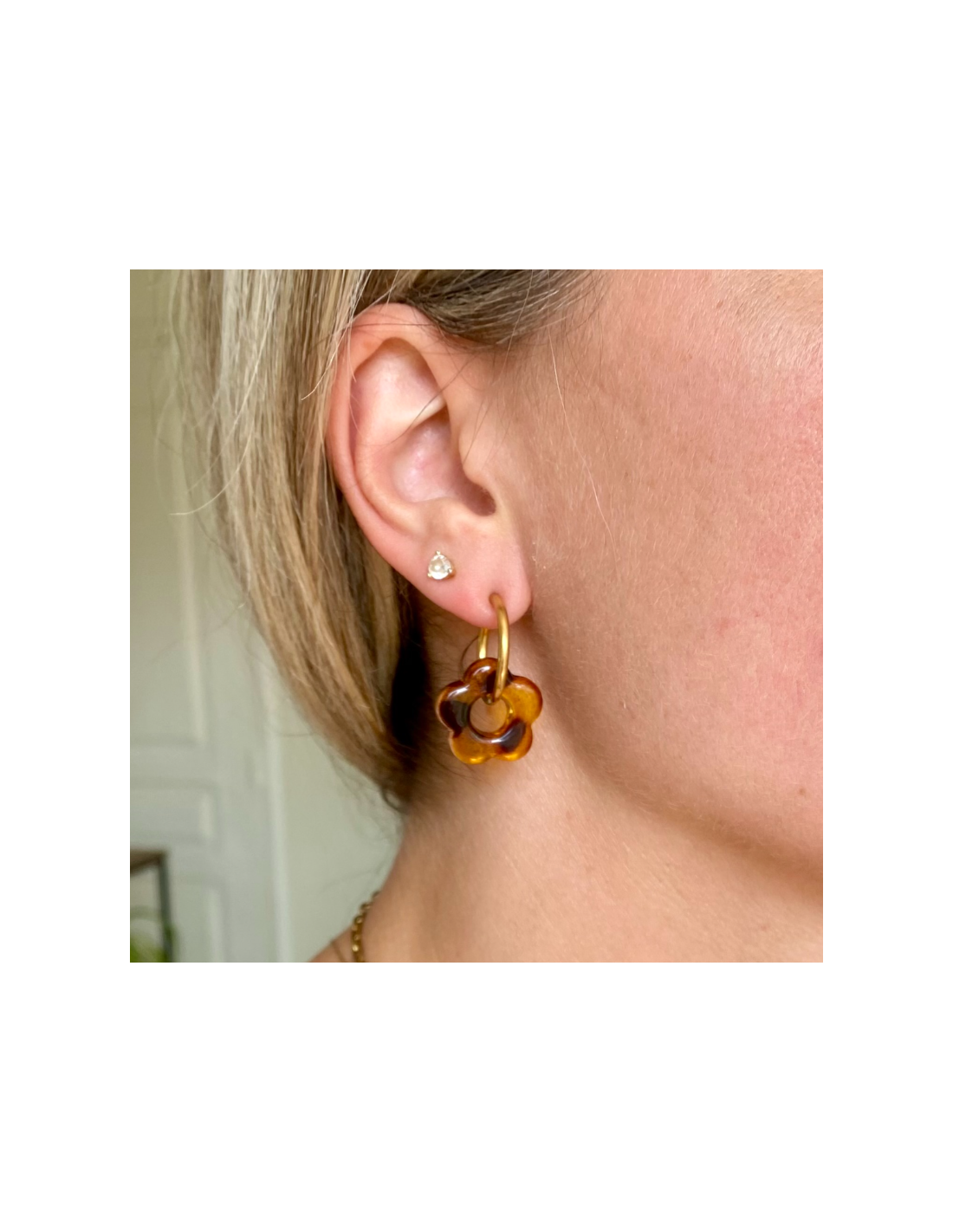• Design : Chaque boucle d’oreille est composée d’une fleur en acétate, un matériau léger et résistant, disponible en 5 coloris éclatants : jaune pâle, bleu ciel, lilas, blanc nacré et écaille