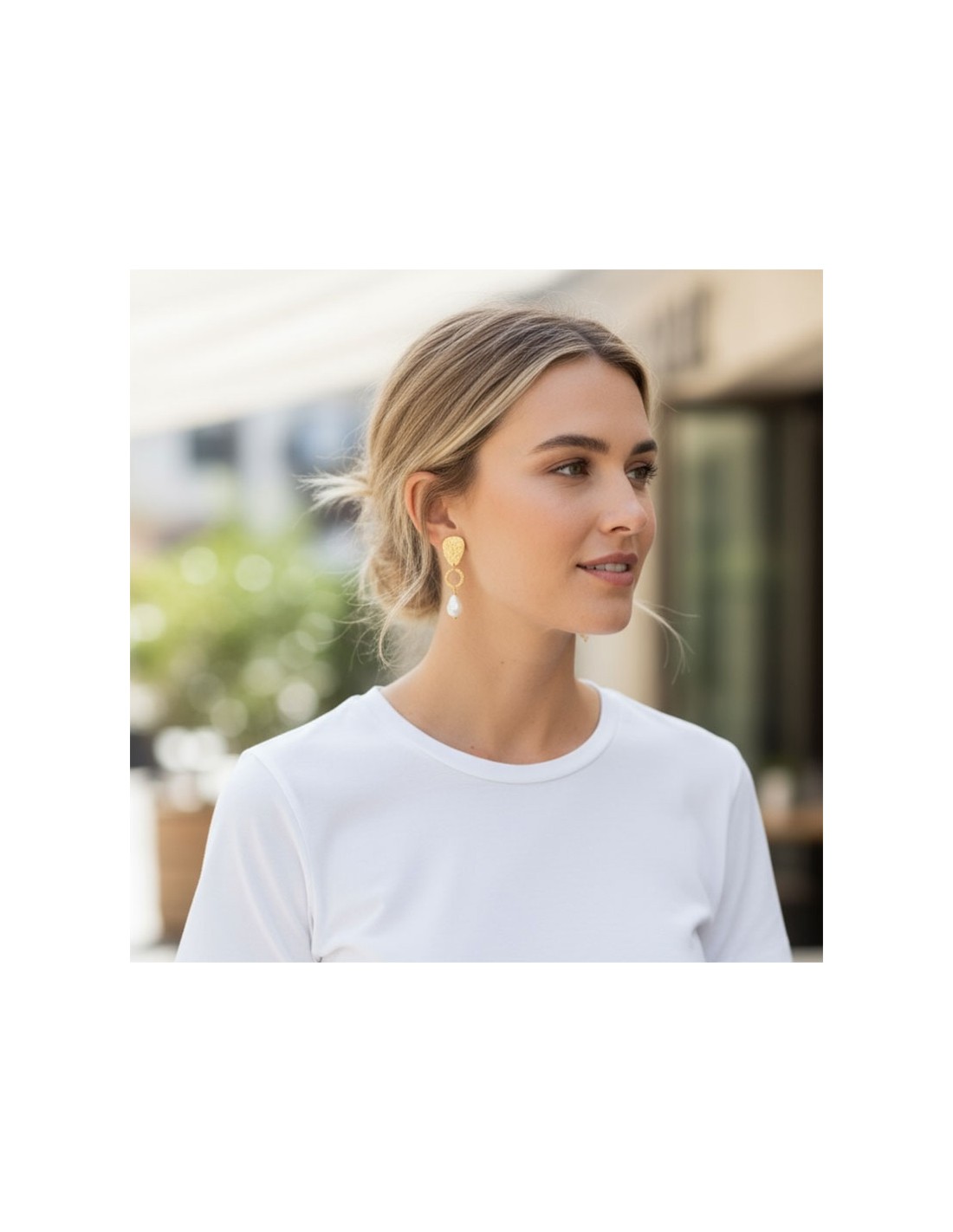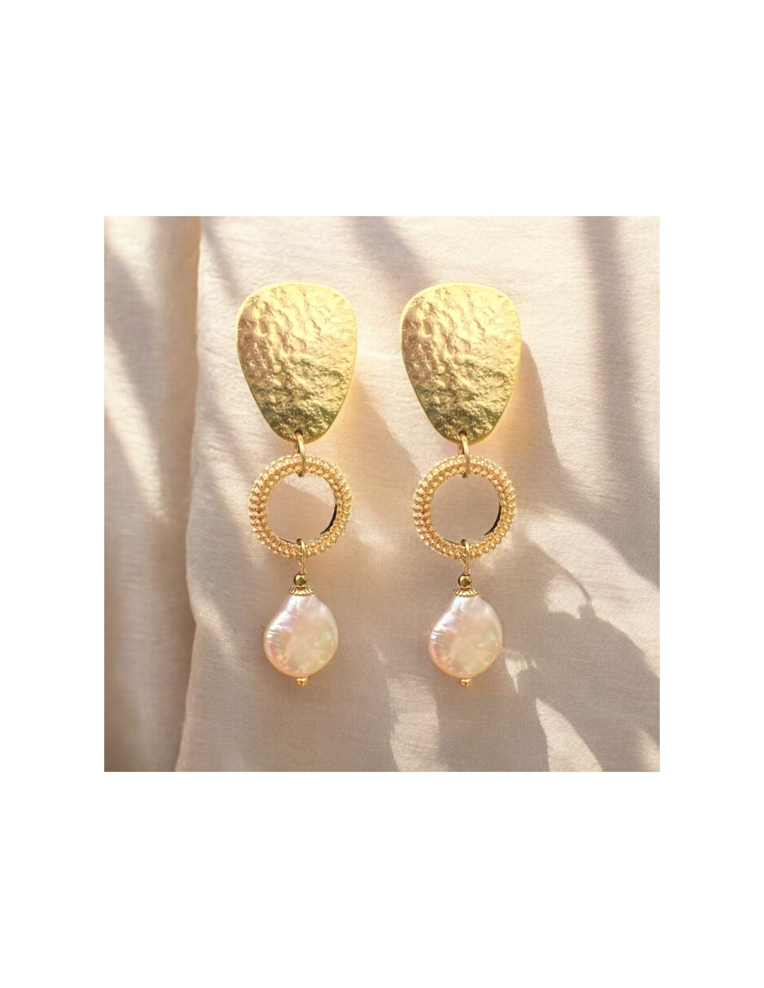 Assemblage d'une perle d'eau douce de qualité AA+ avec une estampe ronde travaillée, fermoir clip forme goutte, ensemble harmonieux et classique. Matériaux de qualité.