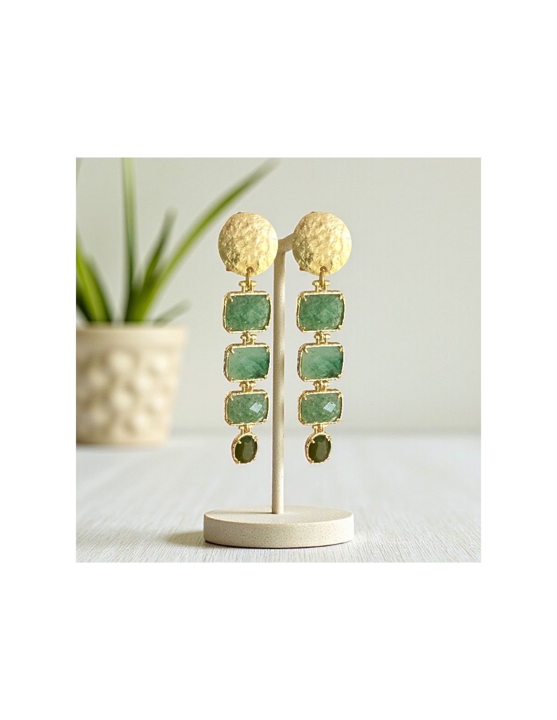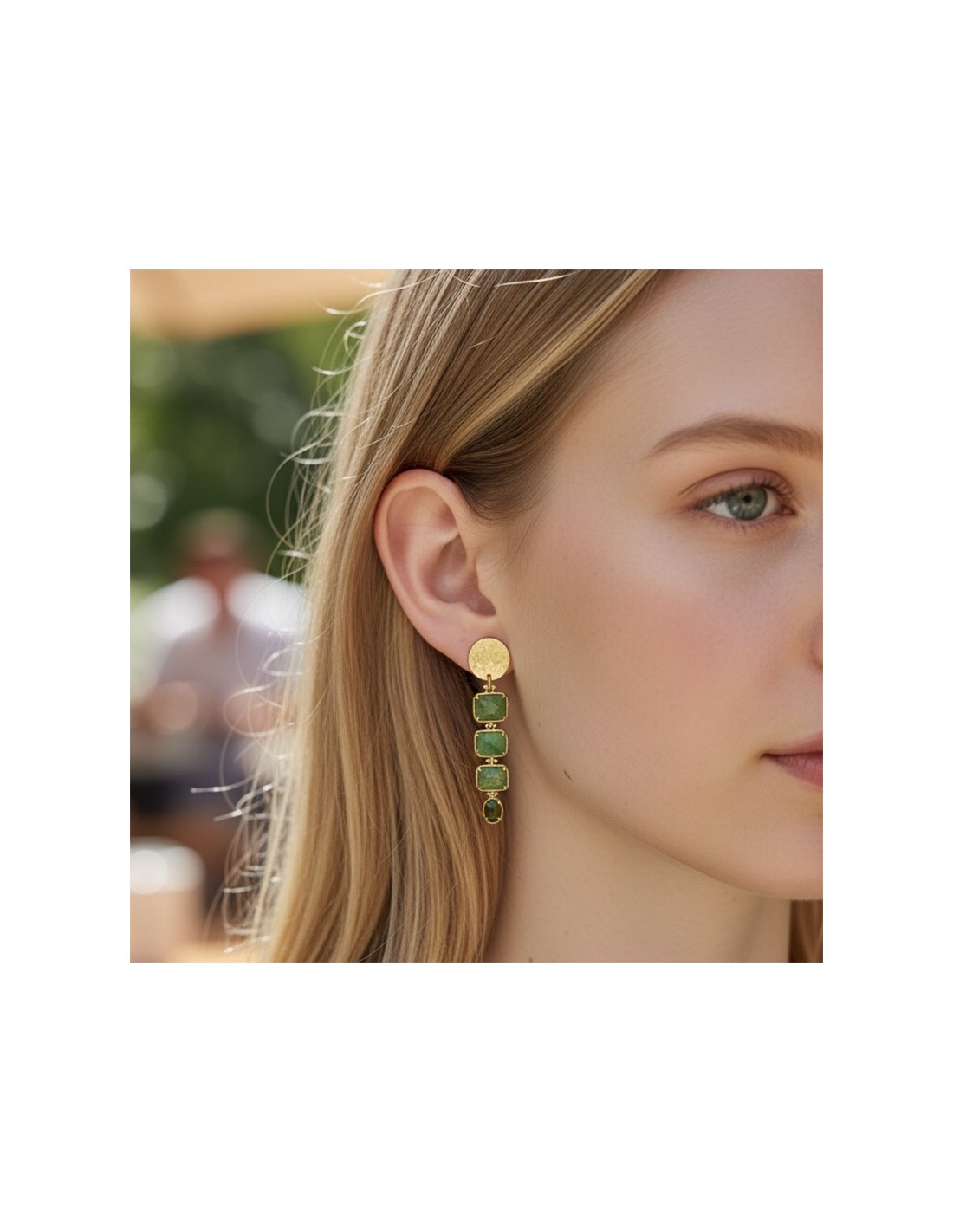 Leur composition associe un disque martelé doré, moderne et lumineux, à une cascade de pierres de jade vert soigneusement taillées, offrant de subtiles variations de teintes naturelles. Chaque élément est délicatement serti dans une monture plaqué or, créant un contraste précieux entre éclat métallique et douceur minérale.