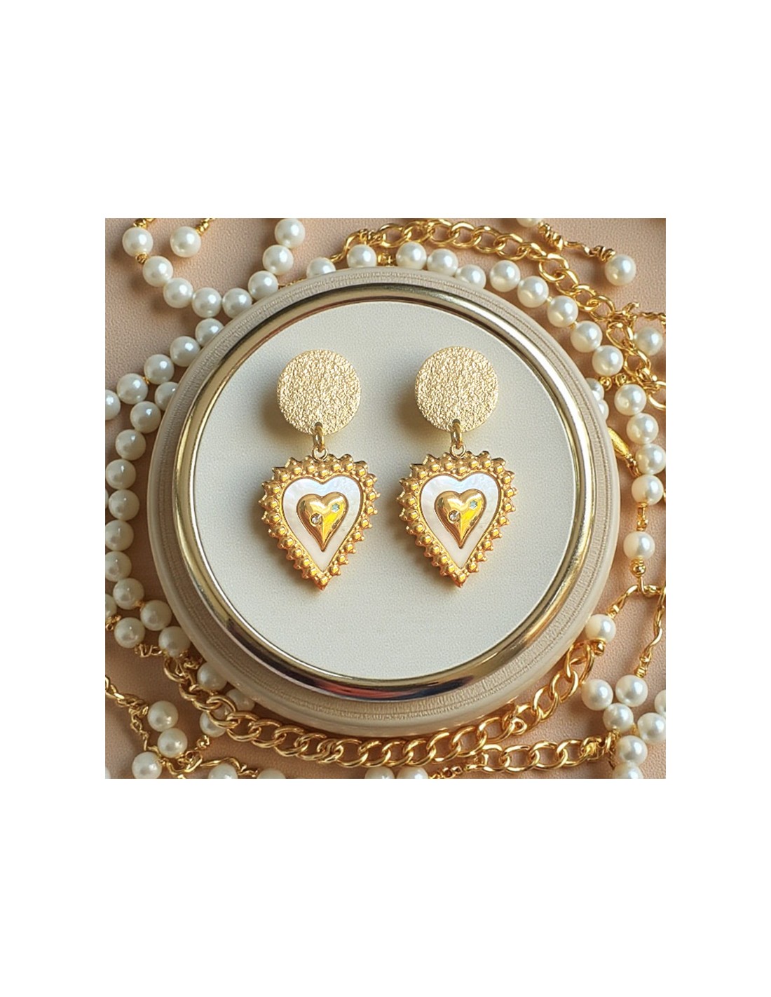 Chaque cœur est orné d’une nacre lumineuse, entourée d’un cadre doré finement ciselé, qui rappelle les bijoux vintage tout en restant résolument moderne. Au centre, un cristal étincelant apporte une touche de lumière.