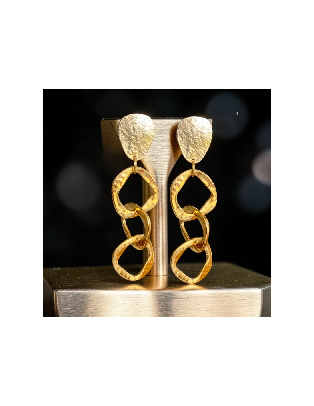 Composées d'un fermoir clip ovale brossé et de trois grands anneaux entrelacés, ces boucles d'oreilles à clips longues affichent une finition martelée. La dorure plaqué or leur confère un éclat chaud et luxueux.