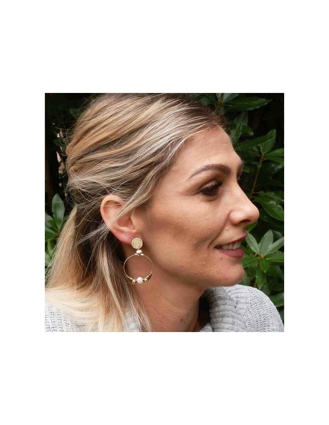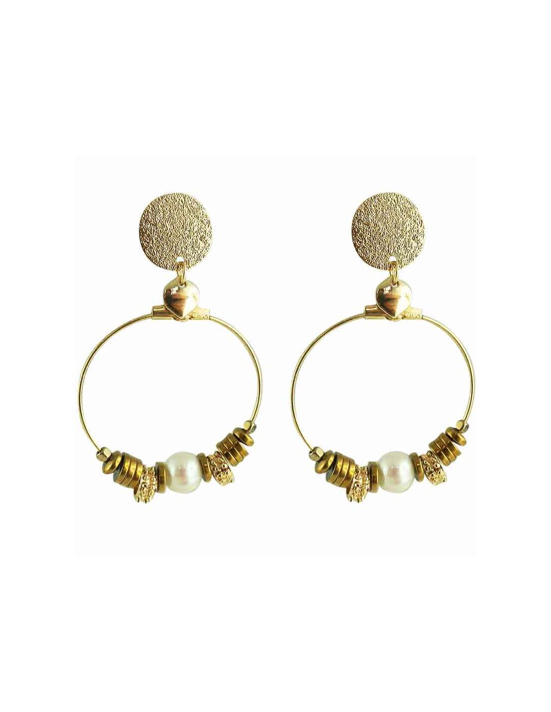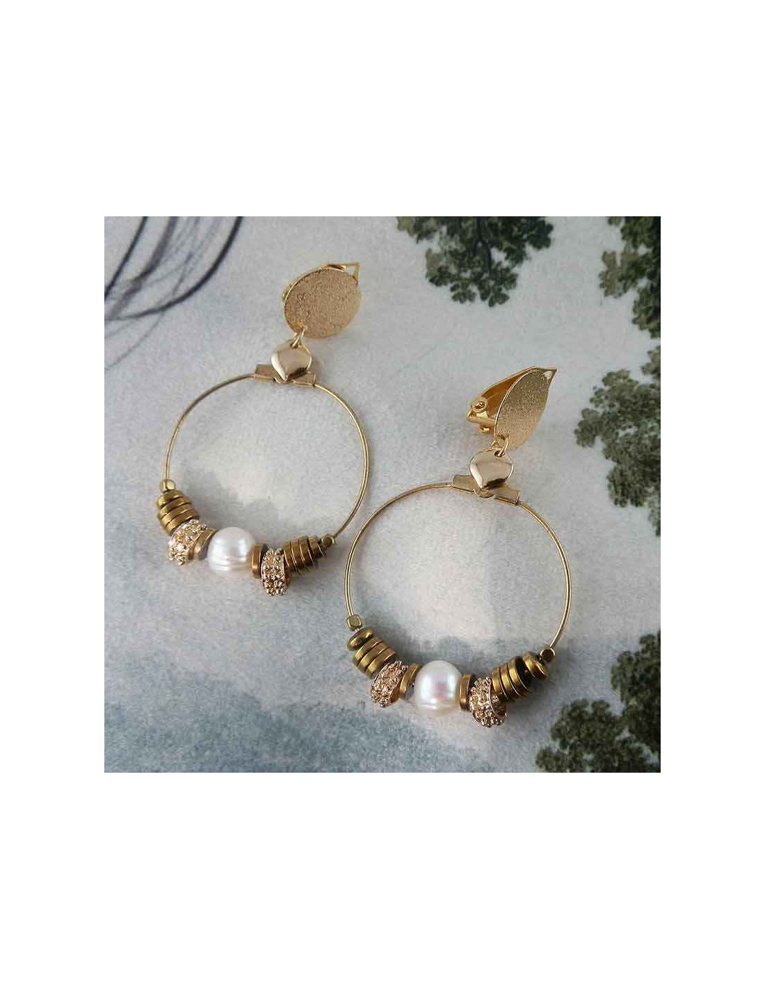 Découvrez ces boucles d’oreilles clips créoles, associant un anneau doré en acier inoxydable à une perle d’eau douce et des détails en métal texturé. Leur design bohème et raffiné apporte une touche d'originalité à toutes vos tenues, sans nécessiter de perçage.