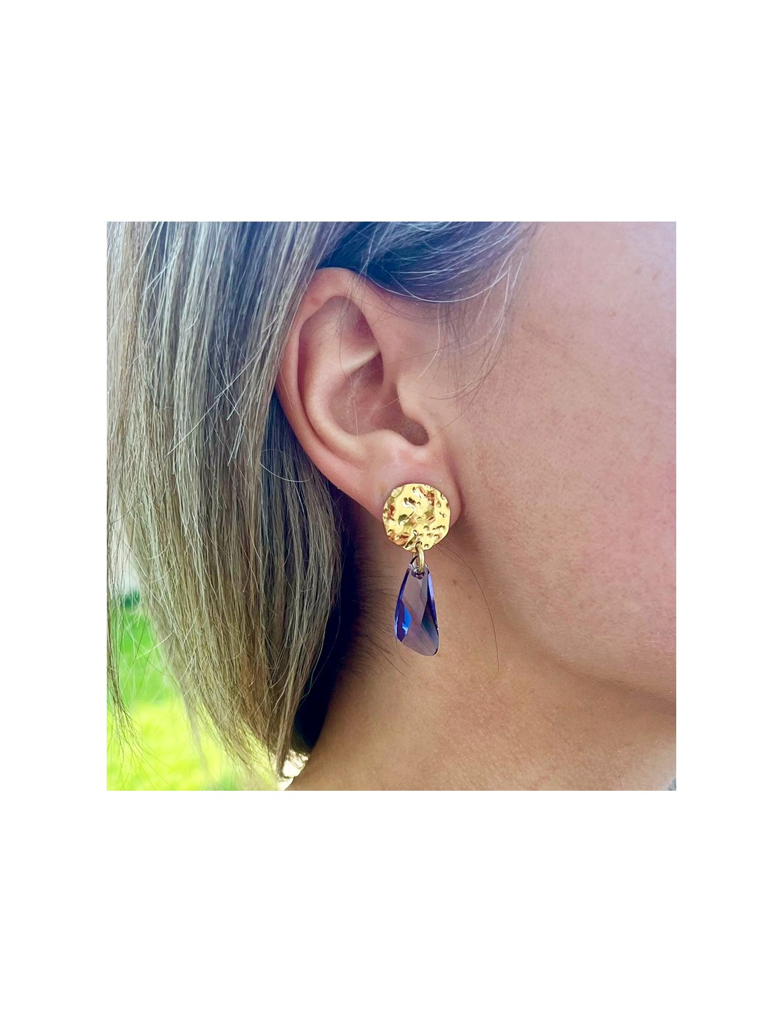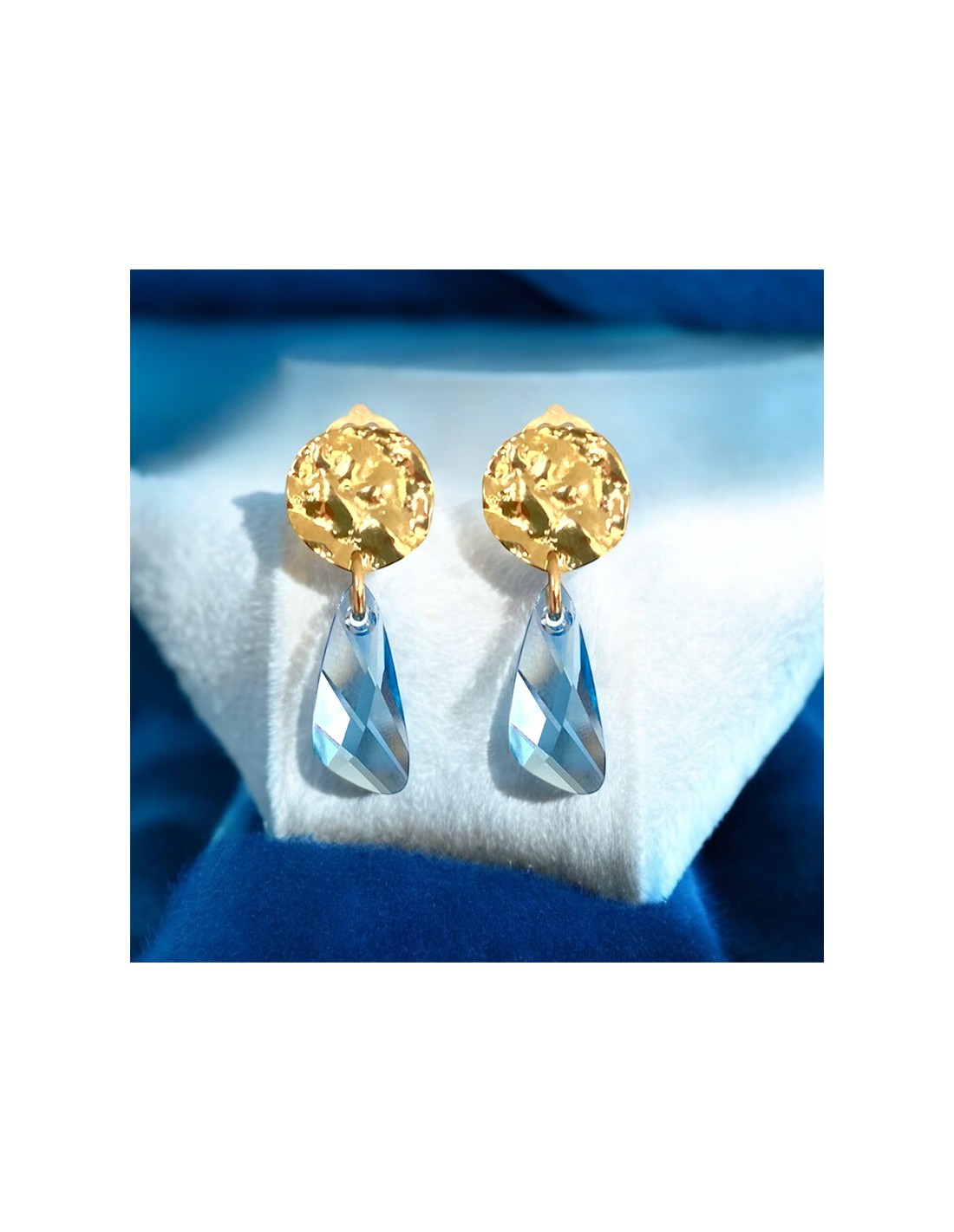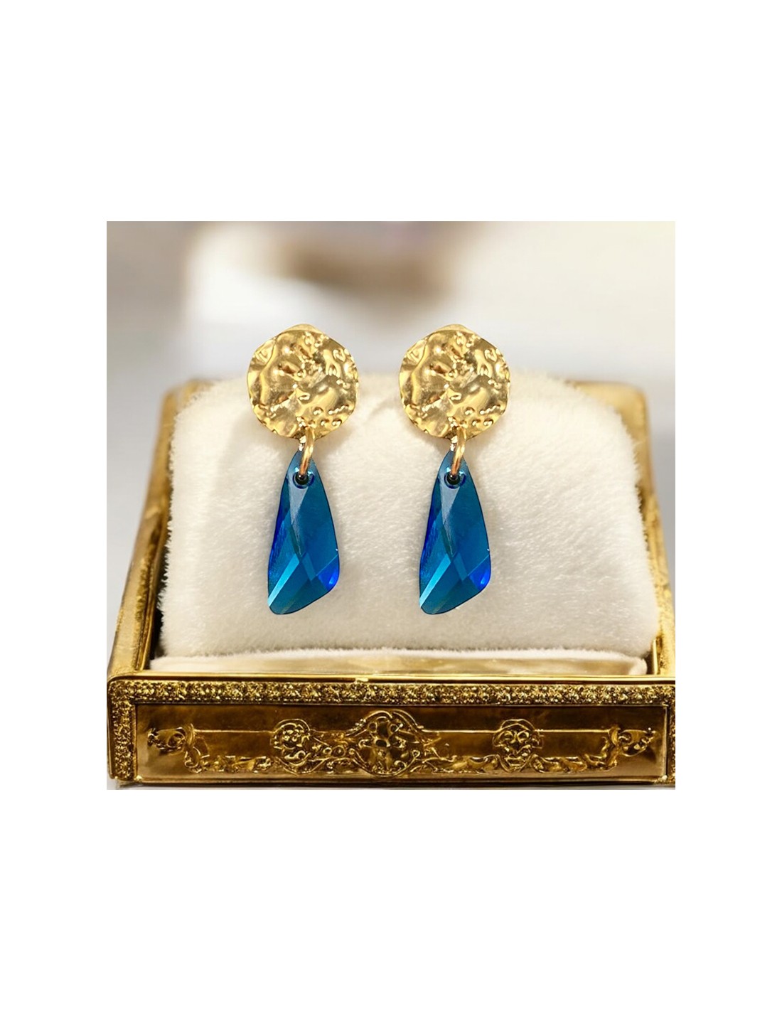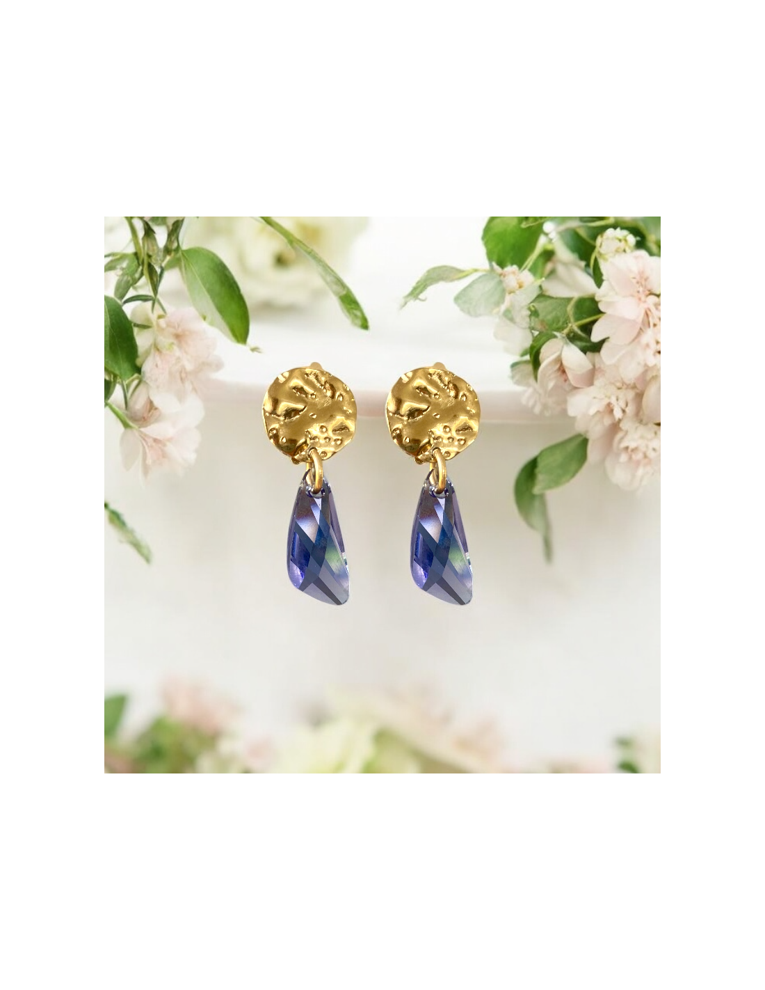 Modèle en cristal Swarovski, coloris Aquamarina, Capri blue, Violet Améthyste ou Beige réhaussé d'un clip en métal doré martelé, création légère, aérienne au coloris lumineux que seul le cristal peut rendre, effet de lumière selon l'éclairage de l'endroit ou vous êtes. Cadeau de qualité et prestigieux., livré dans son écrin.