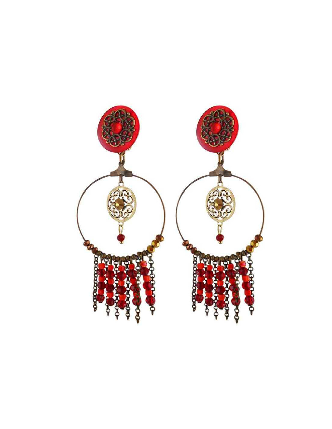 Ces boucles d’oreilles à clip pour femme séduisent par leur design travaillé et leur palette de rouges lumineux, apportant éclat et profondeur au bijou. Le médaillon ajouré finition bronze apporte une touche vintage raffinée, tandis que le grand anneau fin structure la silhouette avec élégance.