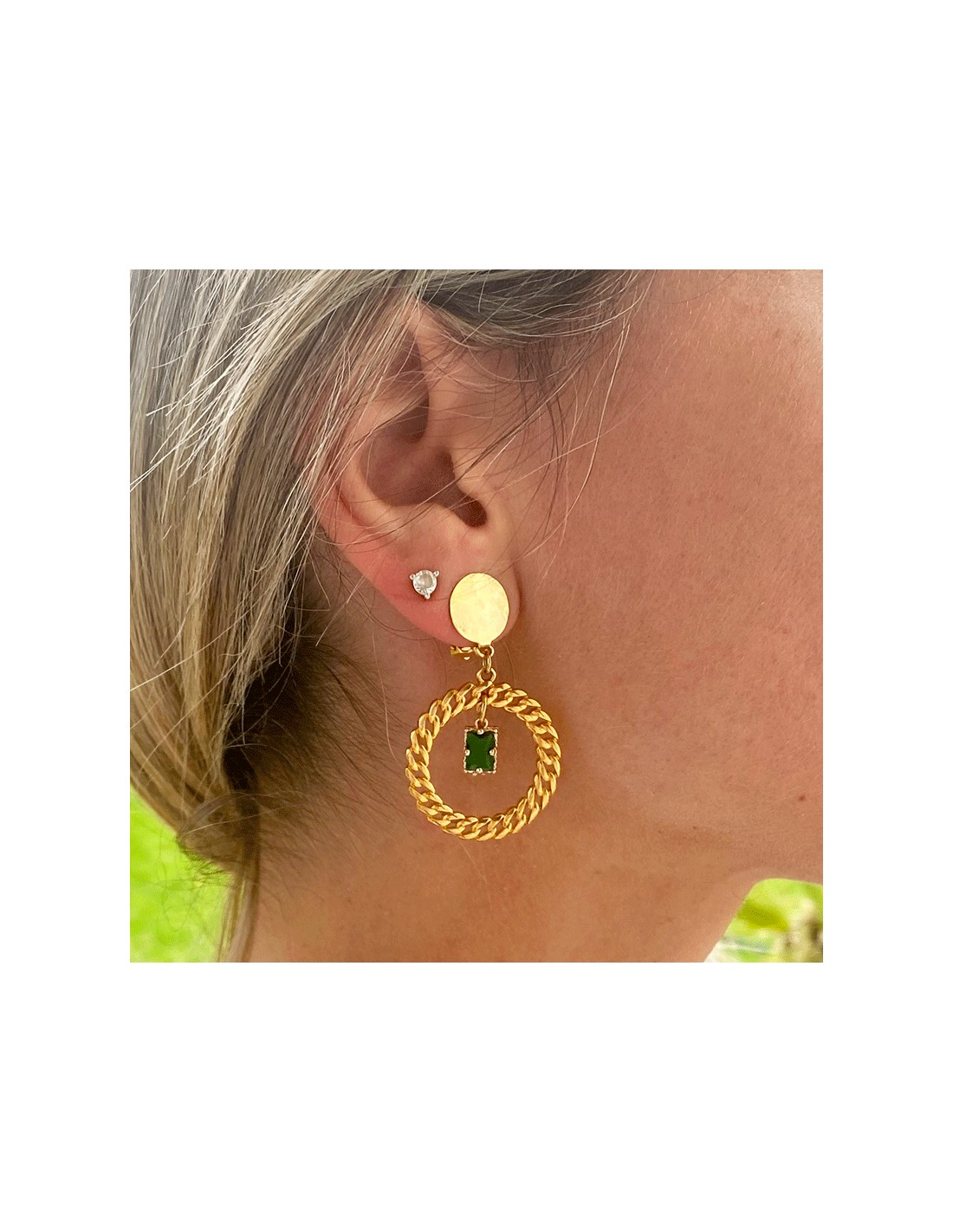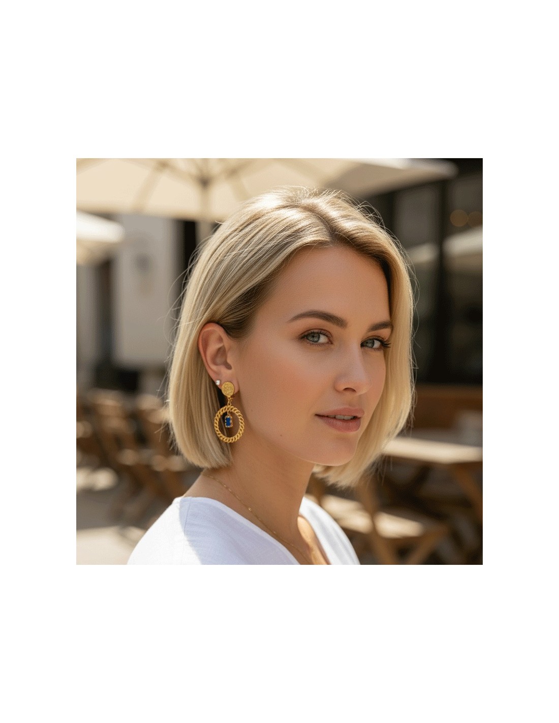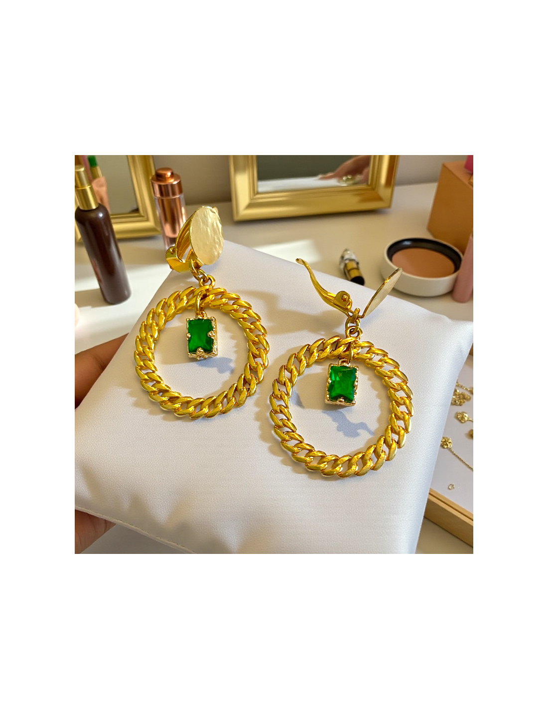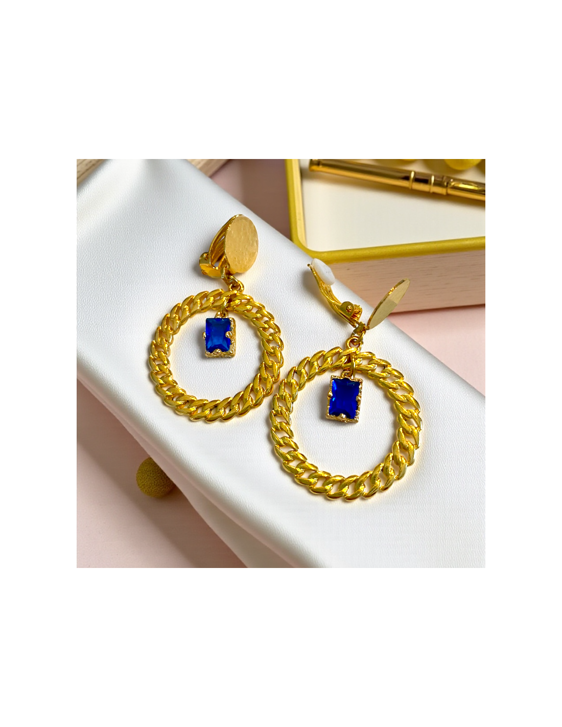 Cette paire de boucles d'oreilles créoles en or doré est un accessoire élégant et raffiné, parfait pour ajouter une touche de sophistication à votre look. Boucle d'oreille à clip qui représente une chaîne épaisse et brillante qui forme un cercle, sublimée par une perle en verre de couleur bleu intense ou vert émeraude taillée en rectangle.