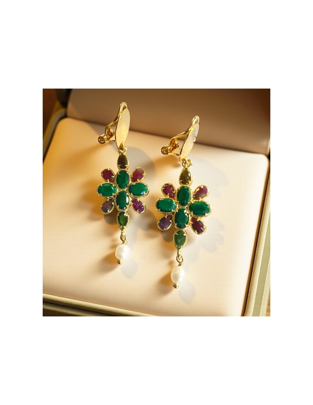 Leur design floral associe des pétales en pierres délicatement serties sur une monture dorée, créant un bijou lumineux et raffiné.
