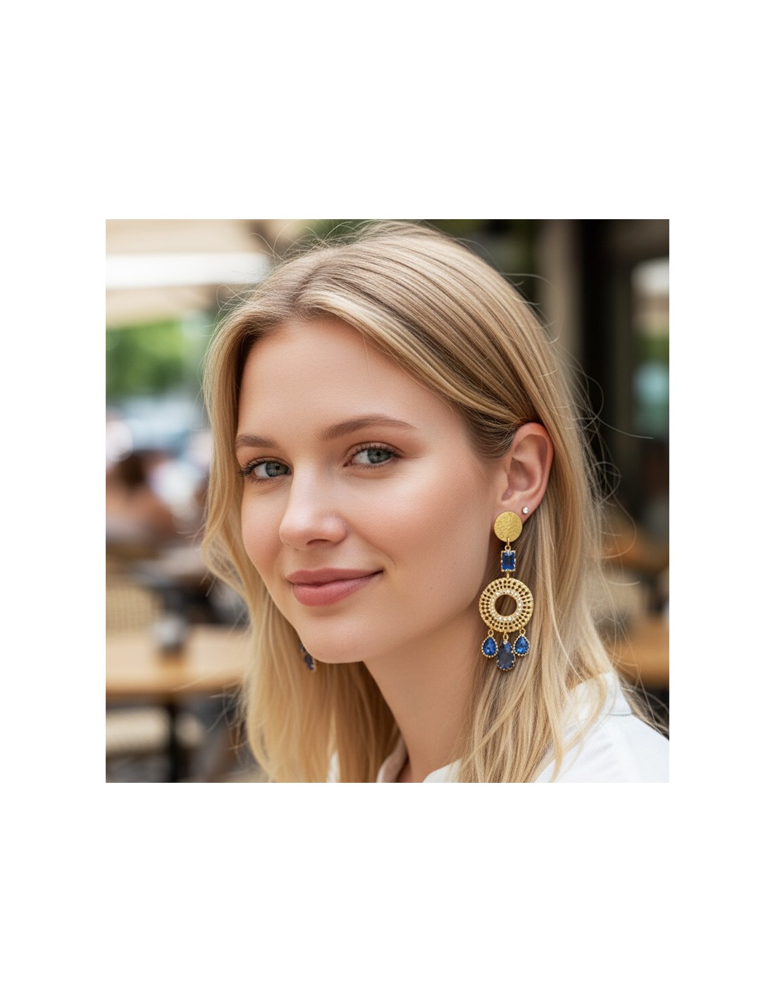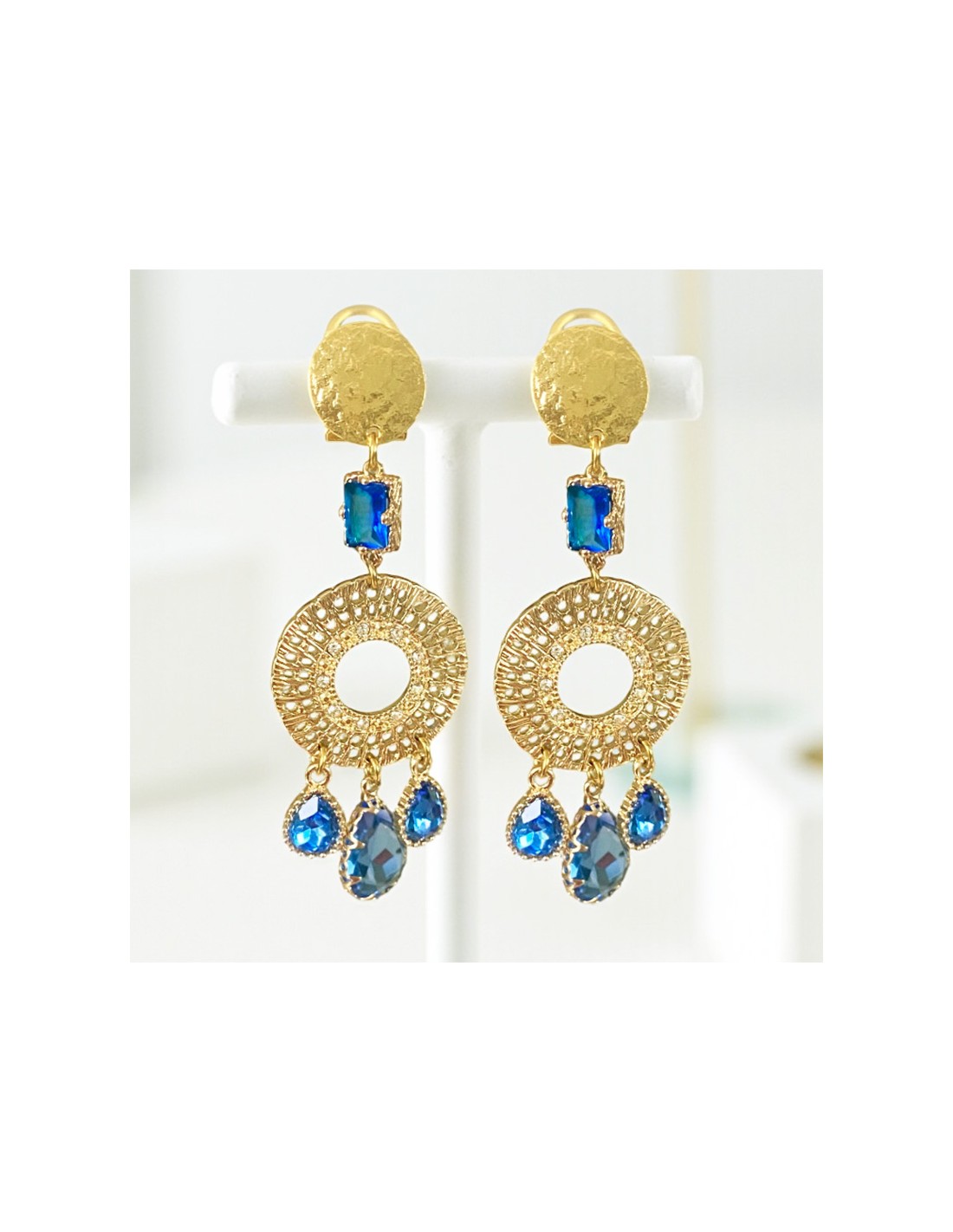Boucle d’oreille à clip pendante dorées ornées de strass bleus. Élégantes, lumineuses et confortables, idéales pour les femmes qui n'ont pas les oreilles percées.