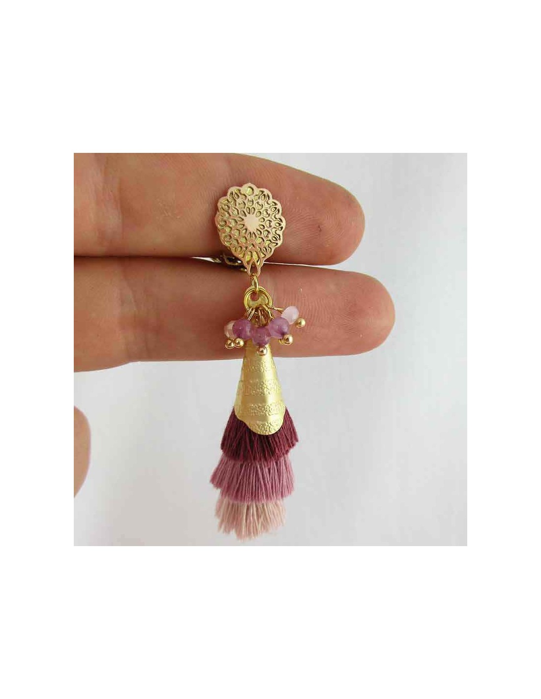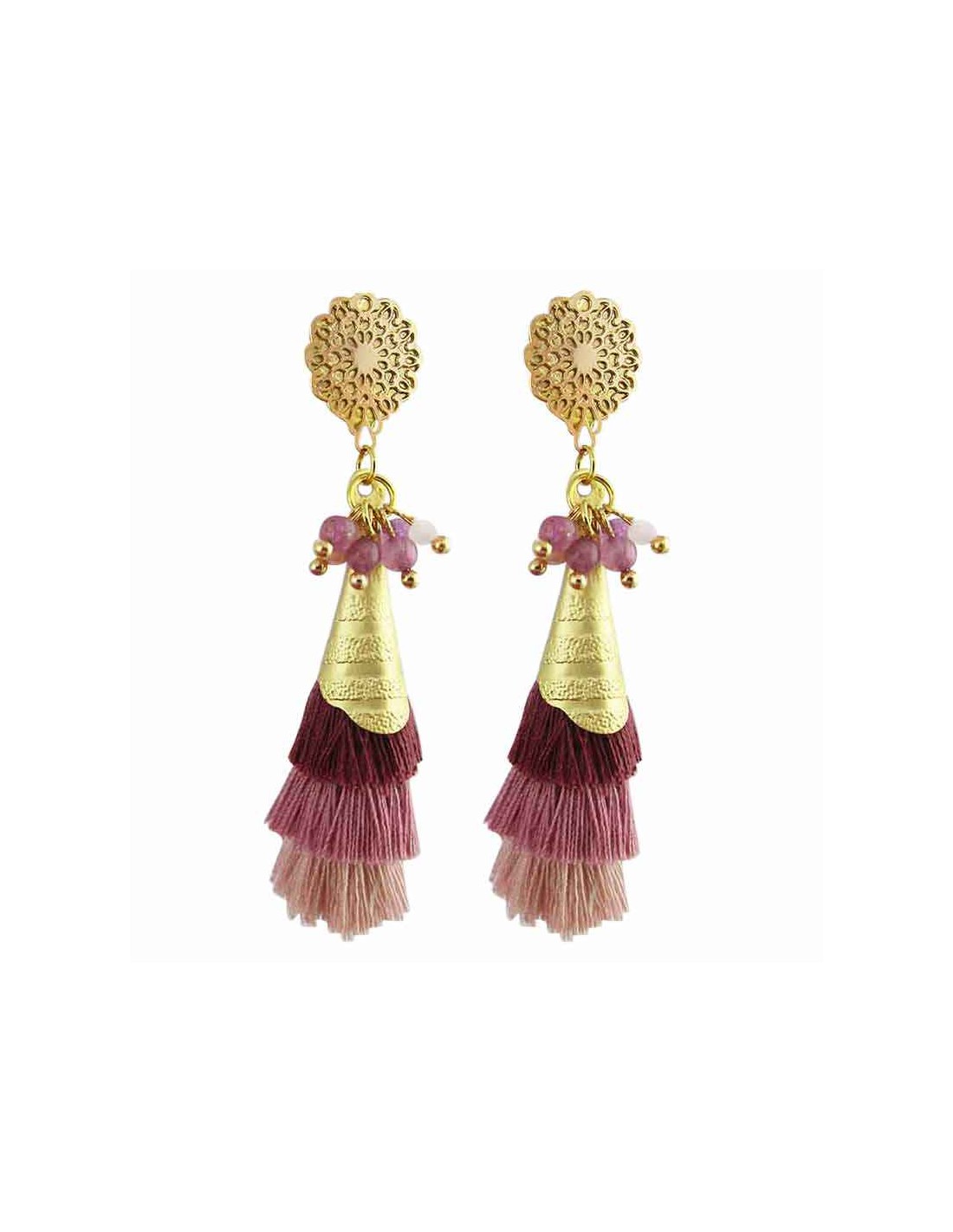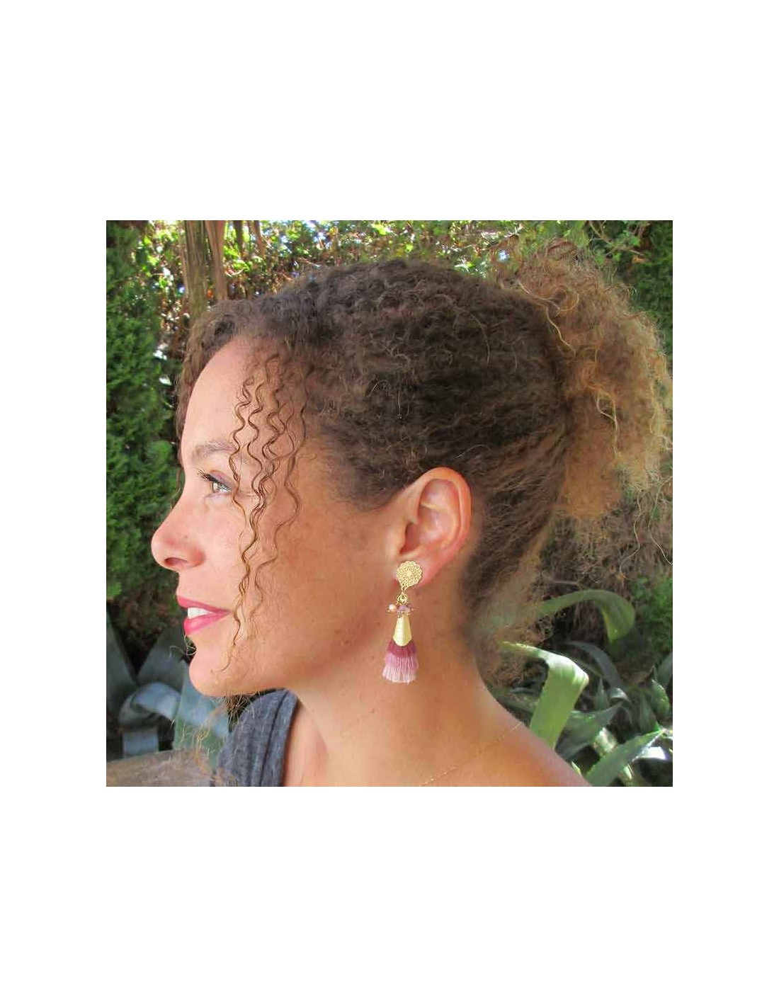 - Des pompons en fils dégradés (rose, mauve et nude), apportant une touche bohème à votre style.