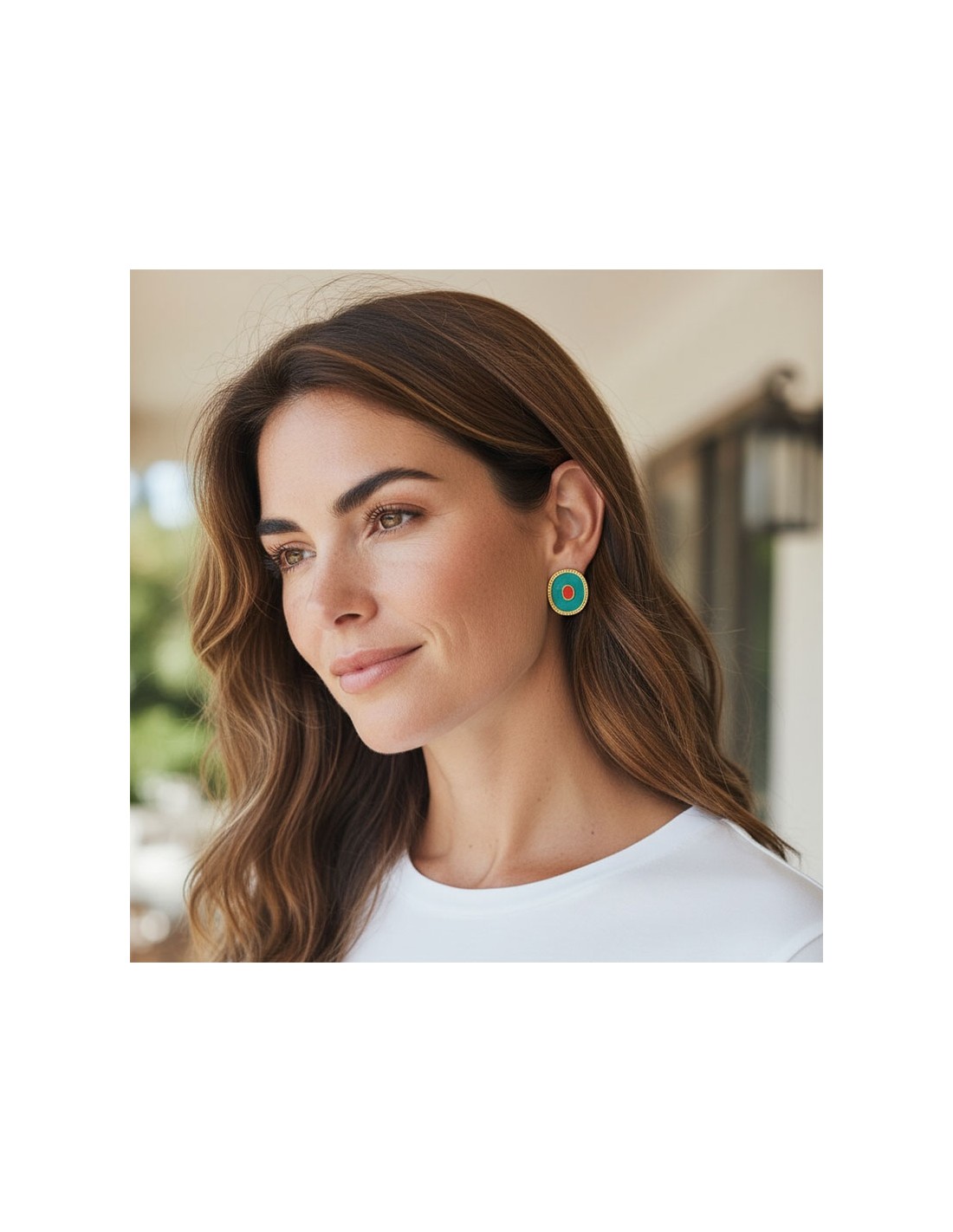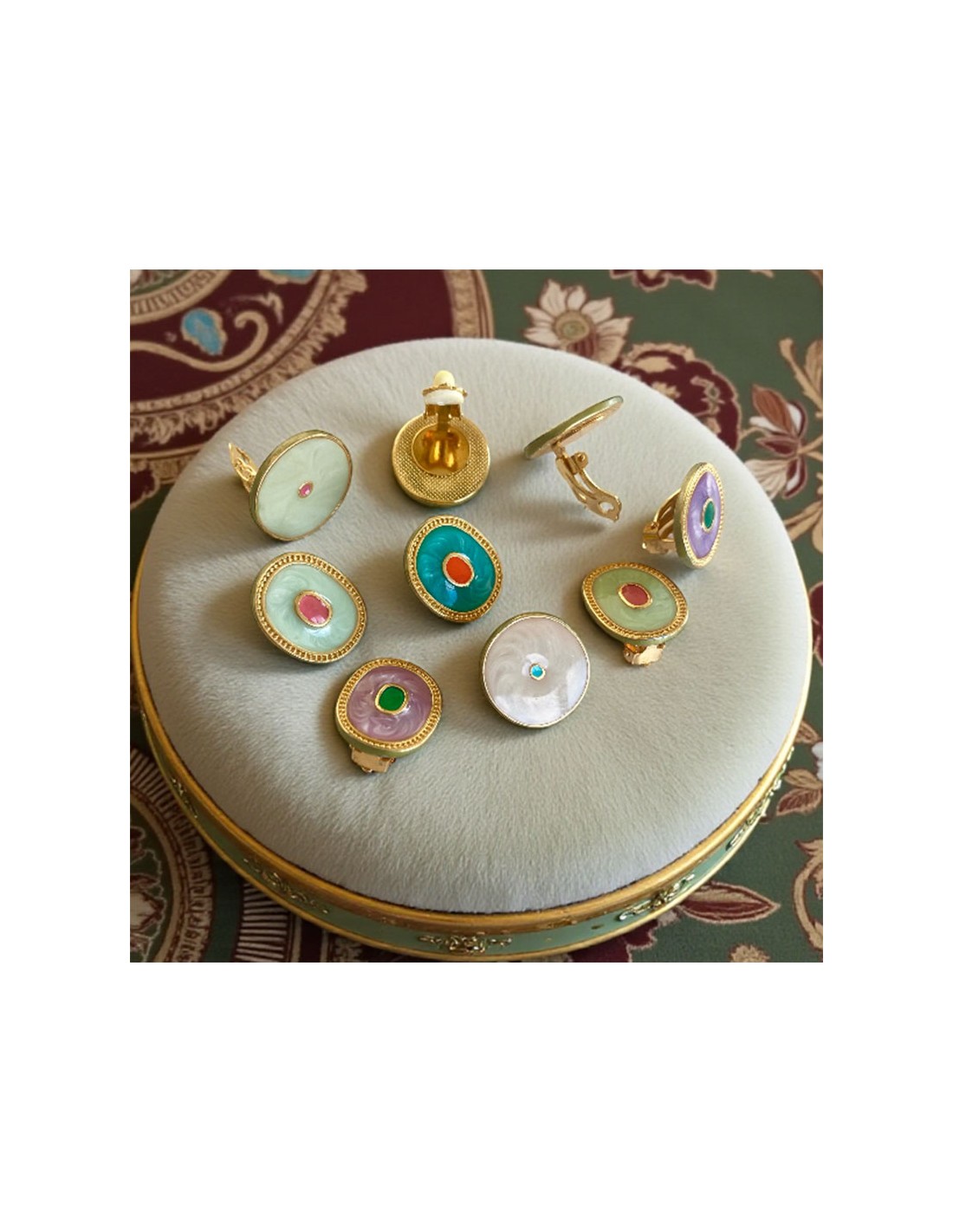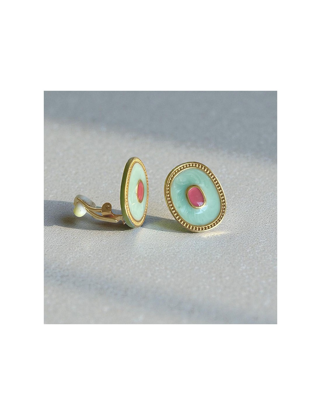 Ces boucles d'oreilles clips pour femme sont conçues pour apporter une touche de couleur à vos tenues. Ces boucles d'oreilles clips se composent d'un médaillon ovale au ton "lilas et vert" "turquoise et orange" ou "amande et orange", ou d'un médaillon rond "vert amande, orange" ou "beige rosé, turquoise".
