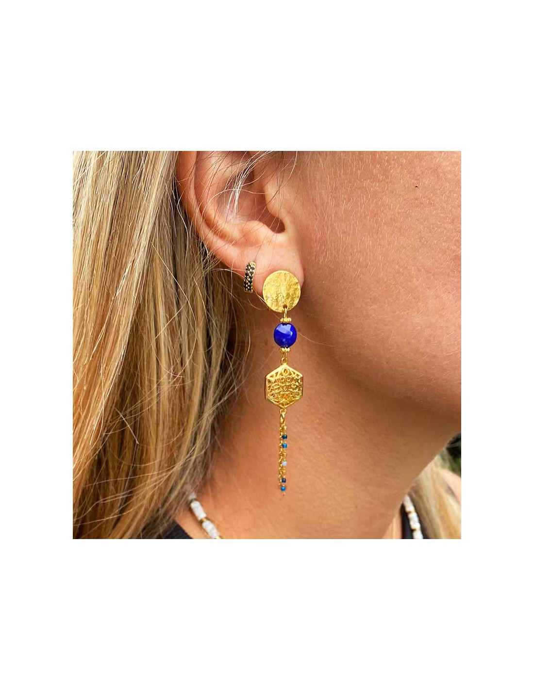 - Le pendentif hexagonal ajouré apporte une touche bohème, tandis que les chaînettes et perles bleues ajoutent du mouvement et de la légèreté.