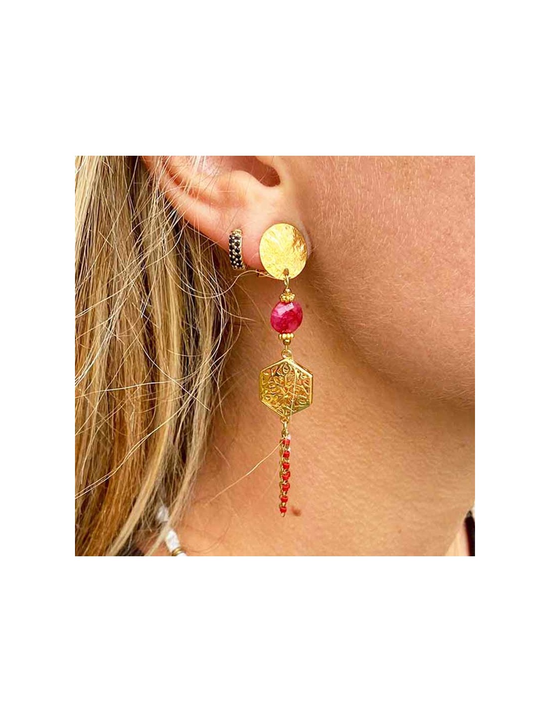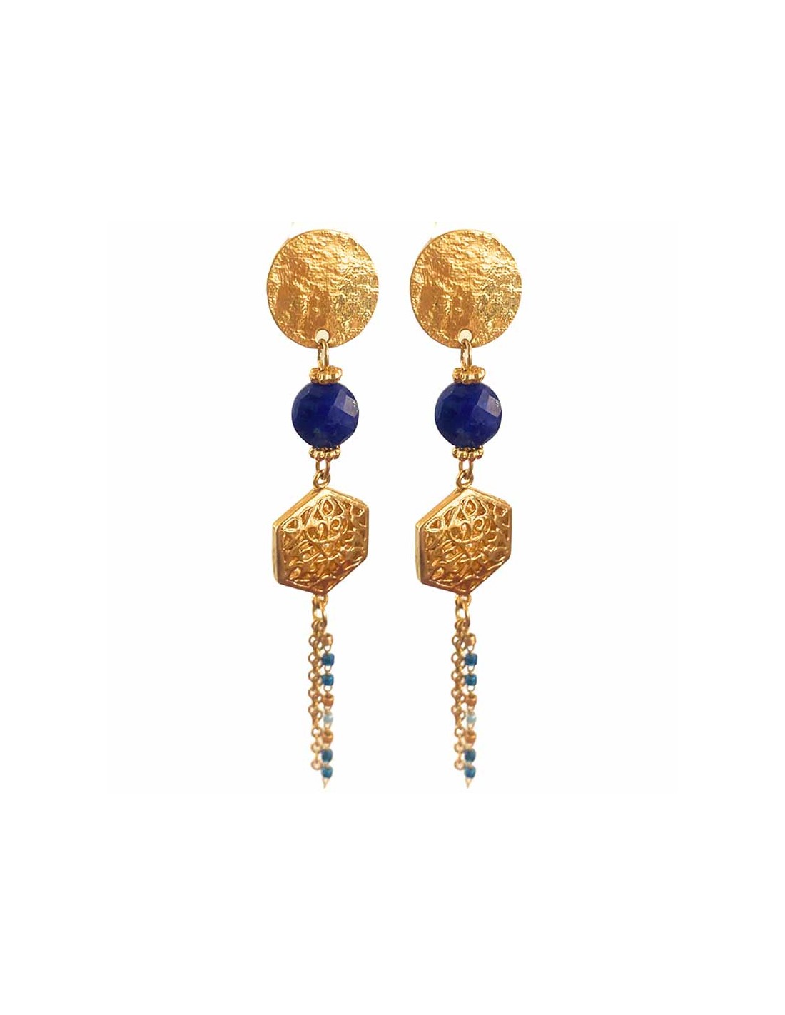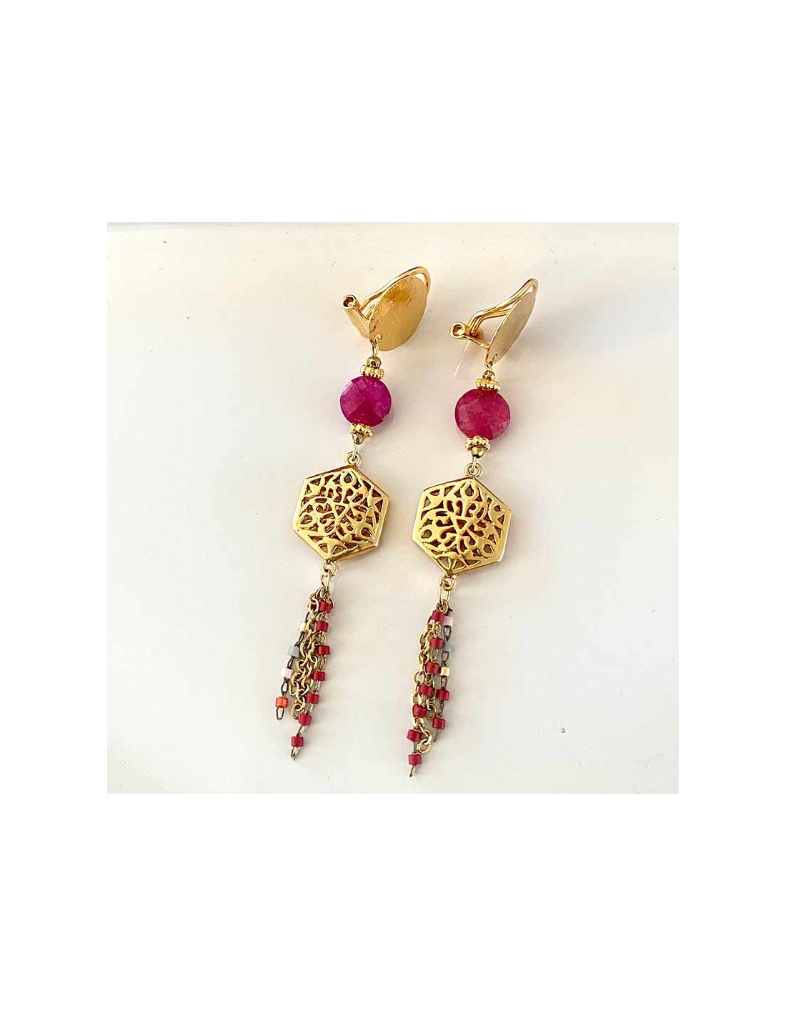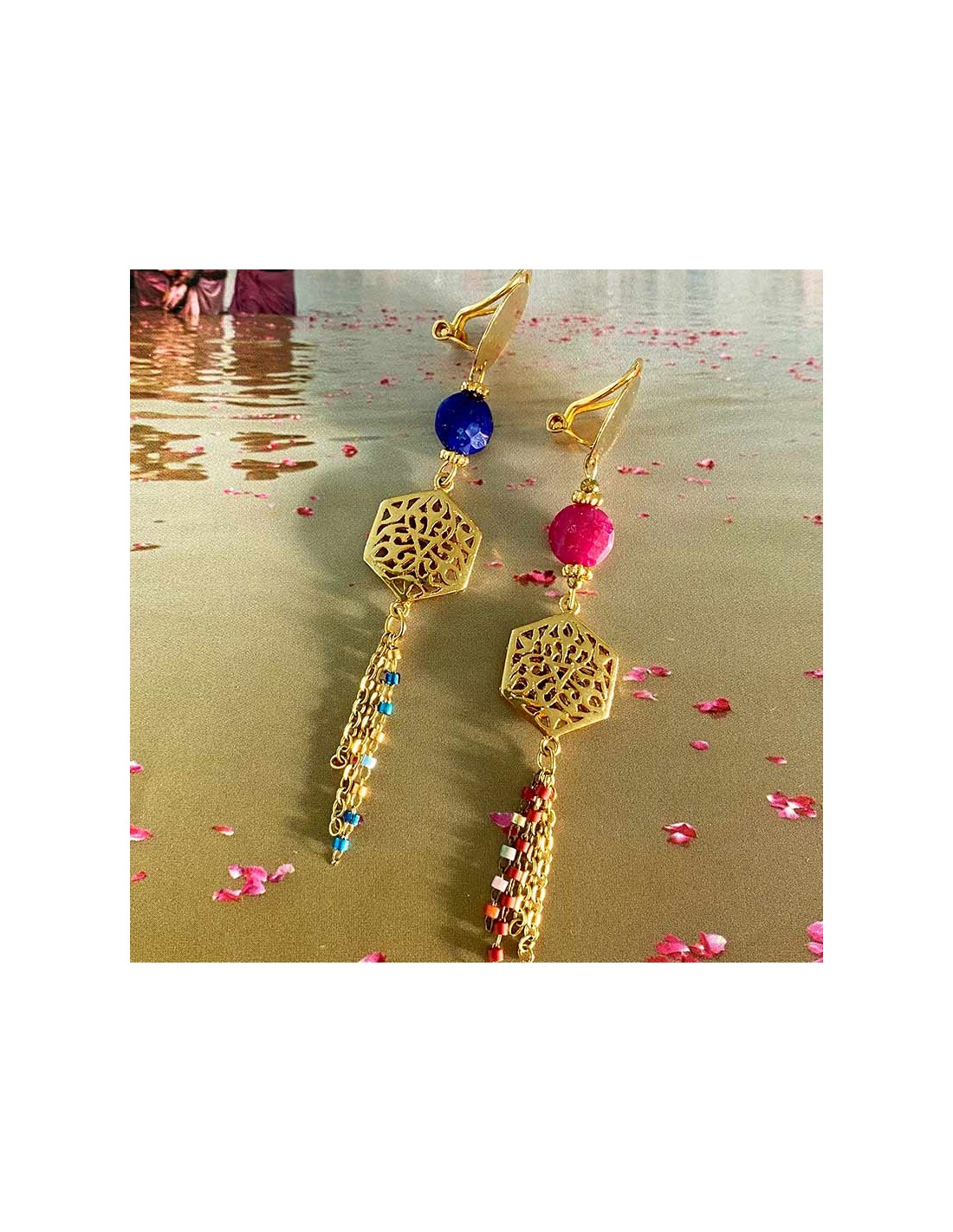 CLIPCHICCréation avec estampe ajourée d'inspiration orientale en plaqué or et chaînettes pendantes en acier inoxydable, l'ensemble est réhaussé d'une pierre à facette de Lapis-Lazuli (bleu)ou d'un Rubis (framboise).